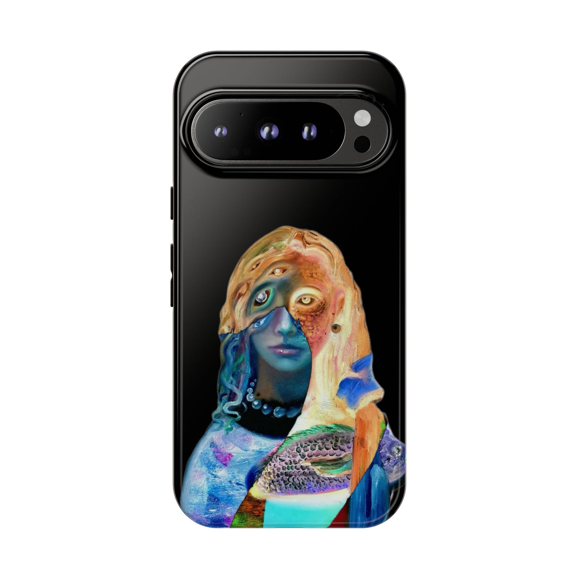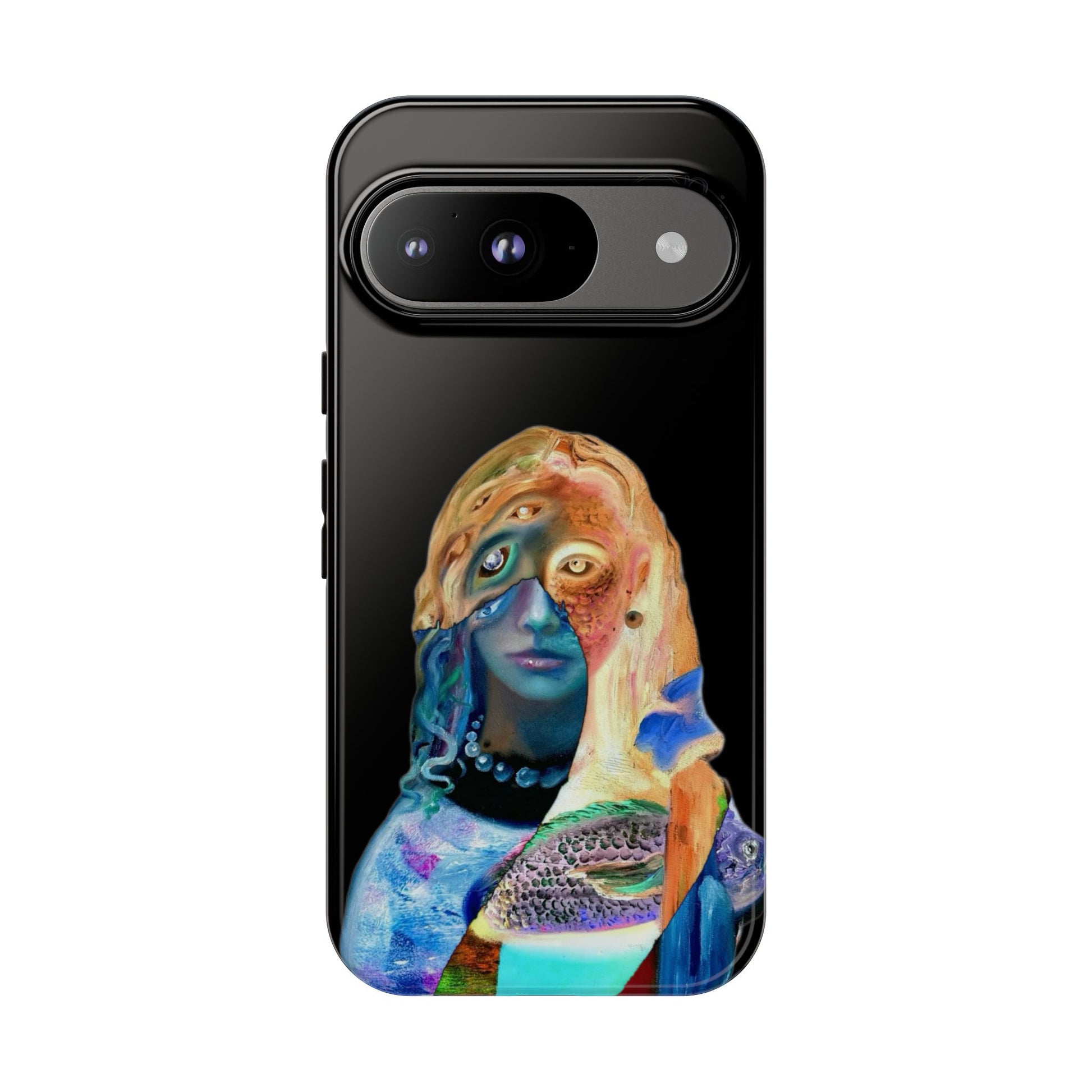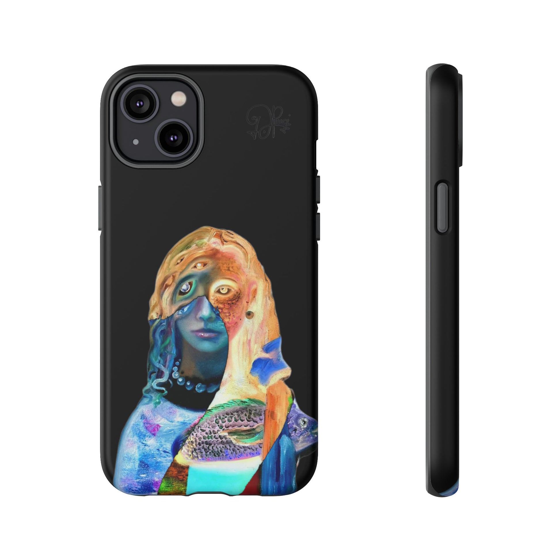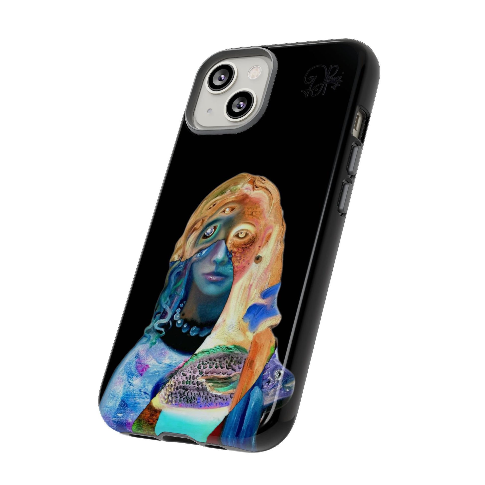 A bold, art-forward protective phone case that turns your device into a moving gallery piece. The dual-layer shell pairs a glossy printed outer polycarbonate with a soft TPU silicone liner, so the surreal portrait print stays vivid while the case soaks up shocks and resists everyday wear. Deep blacks and saturated hues make the collage-style figure pop. Thoughtful cutouts keep ports open and wireless charging accessible, while UV protection helps preserve the image when used outdoors. This case feels like an extension of a creative life — protective, tactile, and visually striking.