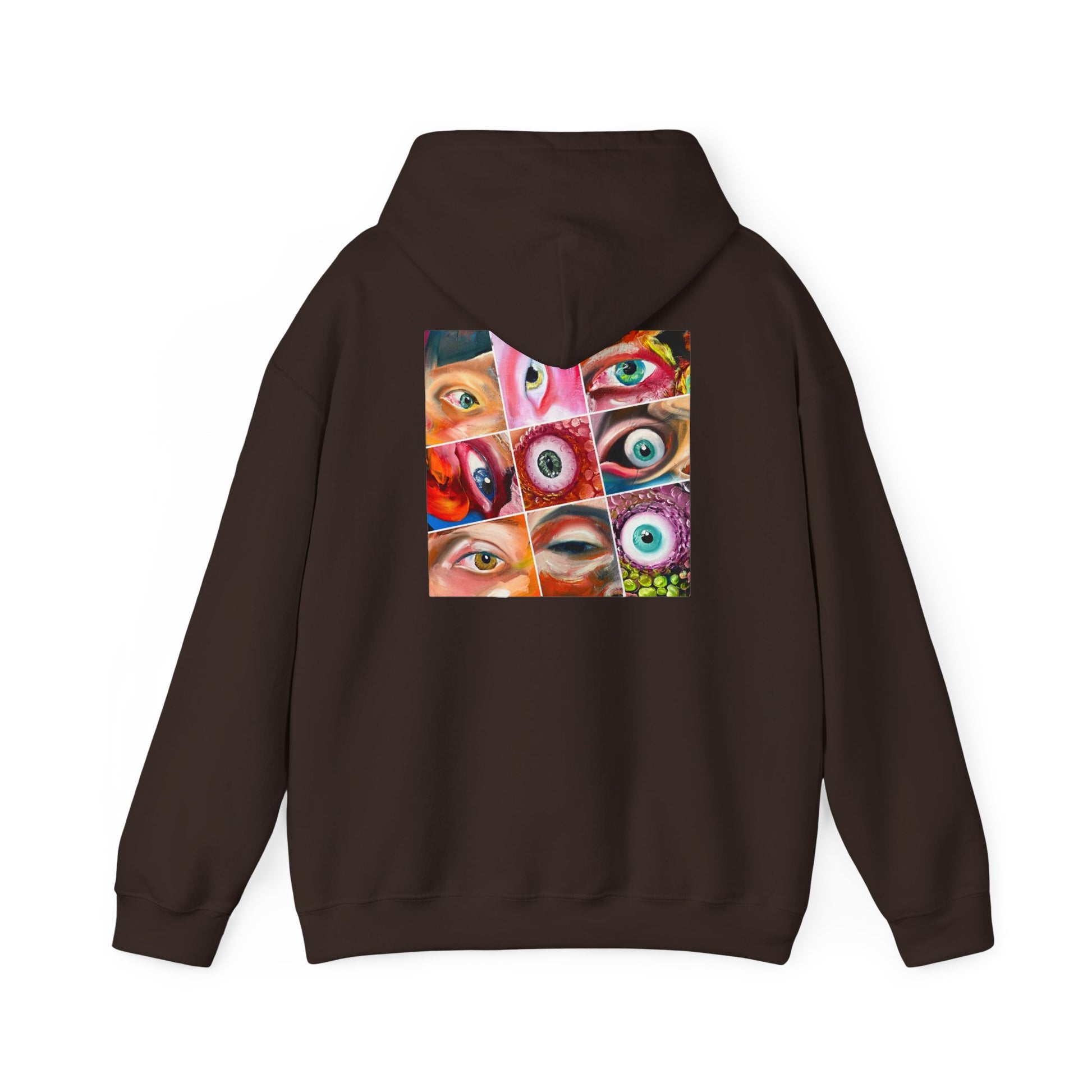 A soft, roomy hoodie that reads like a wearable art piece. The front keeps things minimal with a subtle, elegant wordmark, while the back bursts with a colorful collage of eyes—vivid, curious, and a little uncanny. It feels like slipping into something familiar that also starts conversations. Wear it on slow mornings with coffee, to late-night gallery walks, or layered for cooler studio sessions. The pouch pocket and double-lined hood add everyday comfort, and the sturdy cotton/poly blend holds the print details bright after many washes. This piece suits someone who likes quiet, refined details up front and bold, expressive visuals behind—an effortless way to carry personality without shouting for attention.