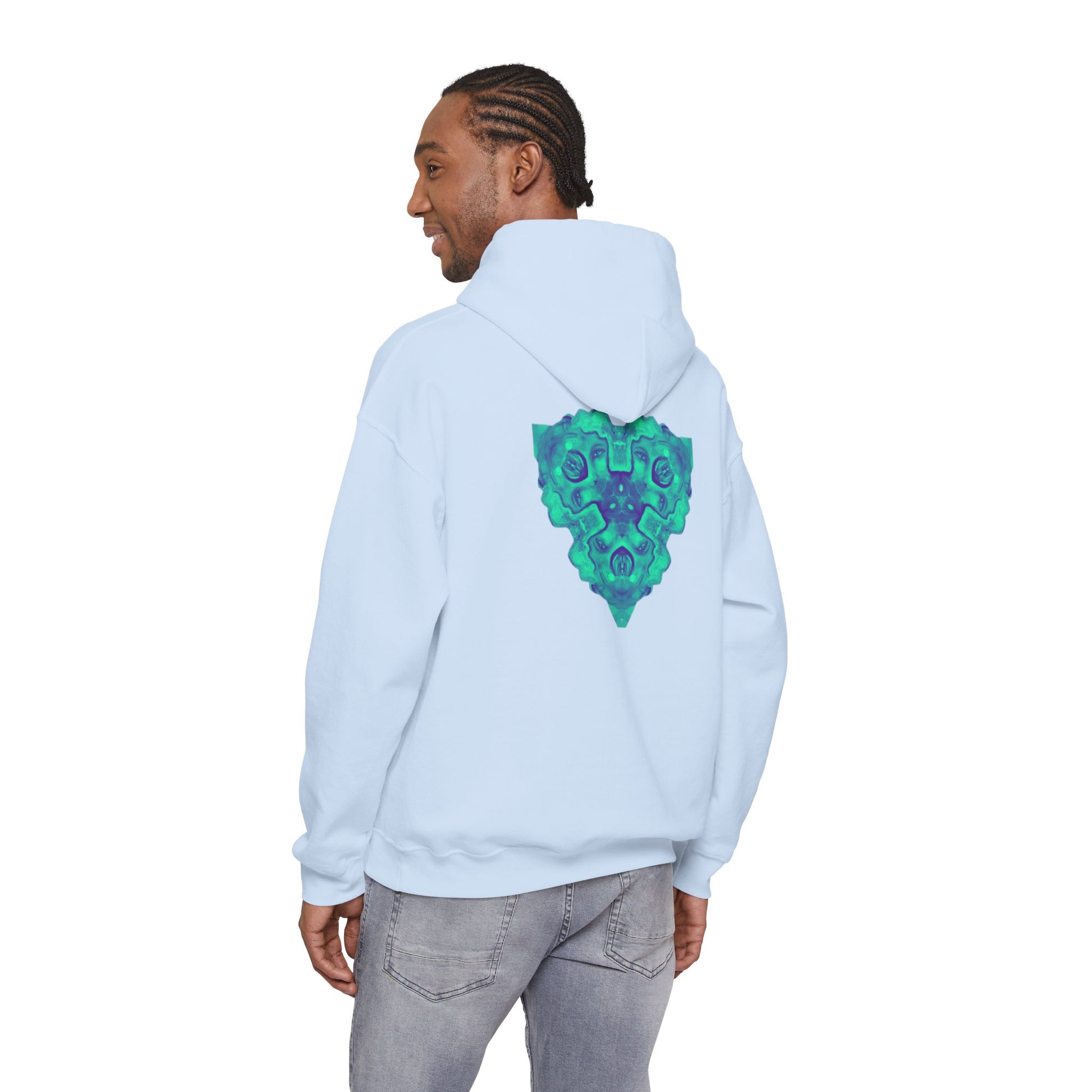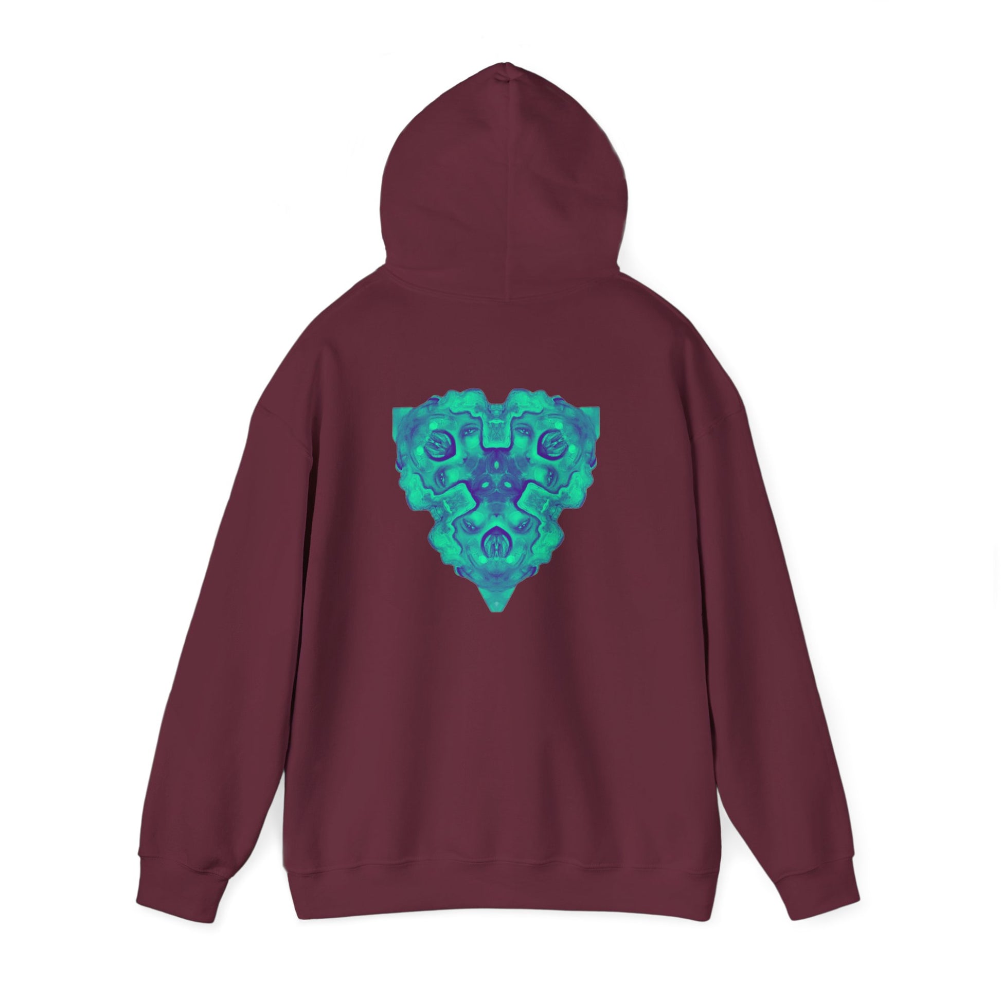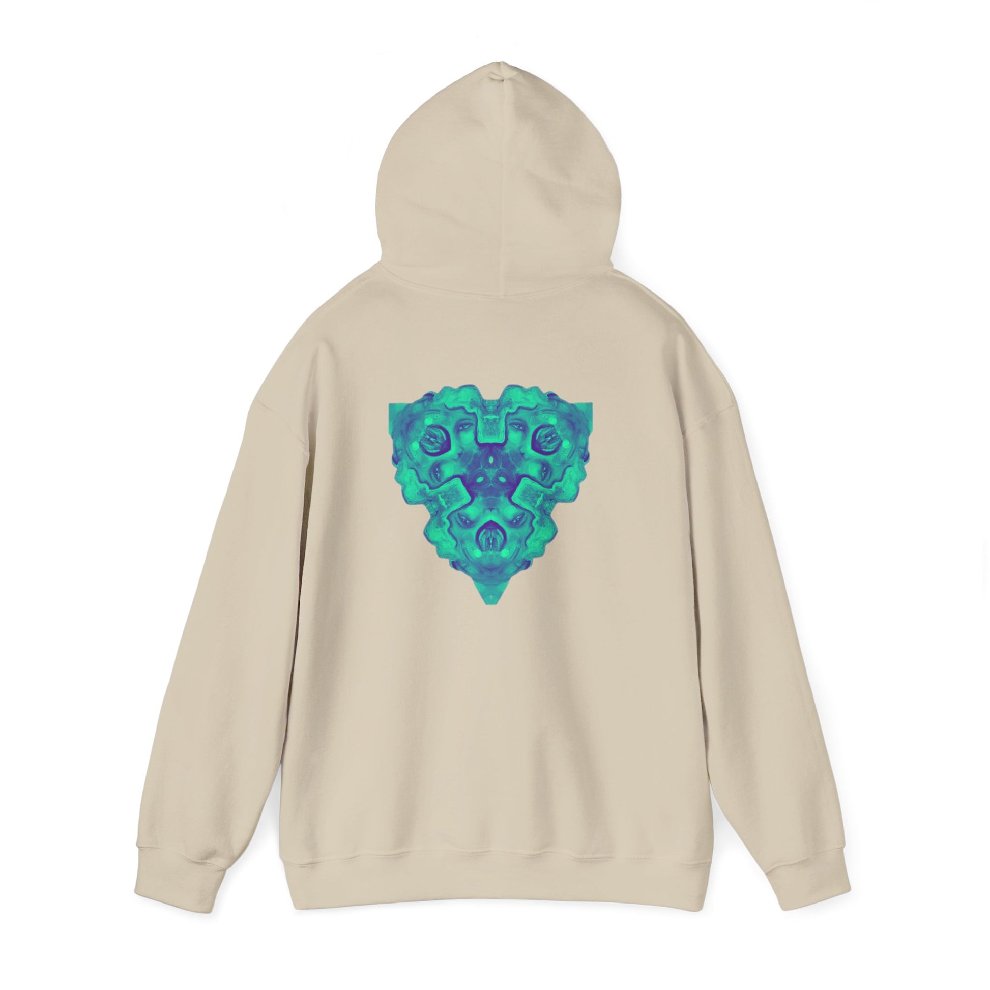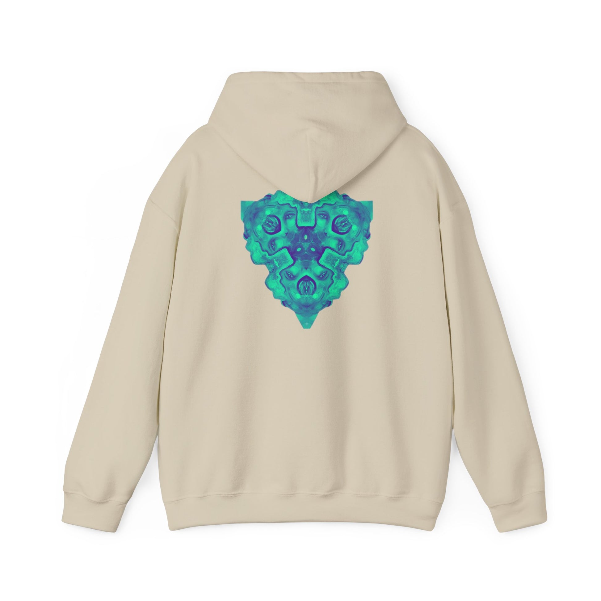 AMRU Minimal Logo Hoodie — Geometric Teal Mandala Back Graphic