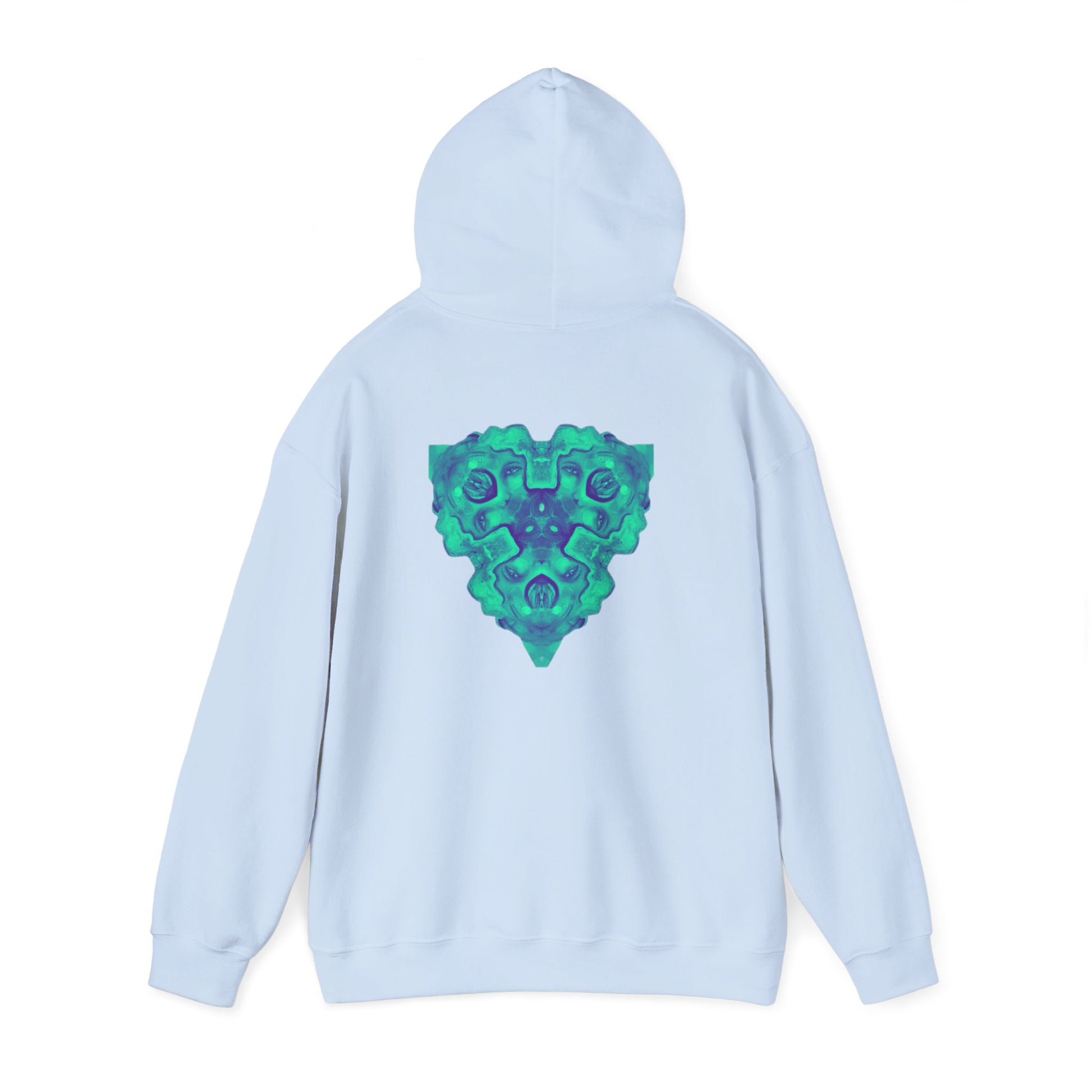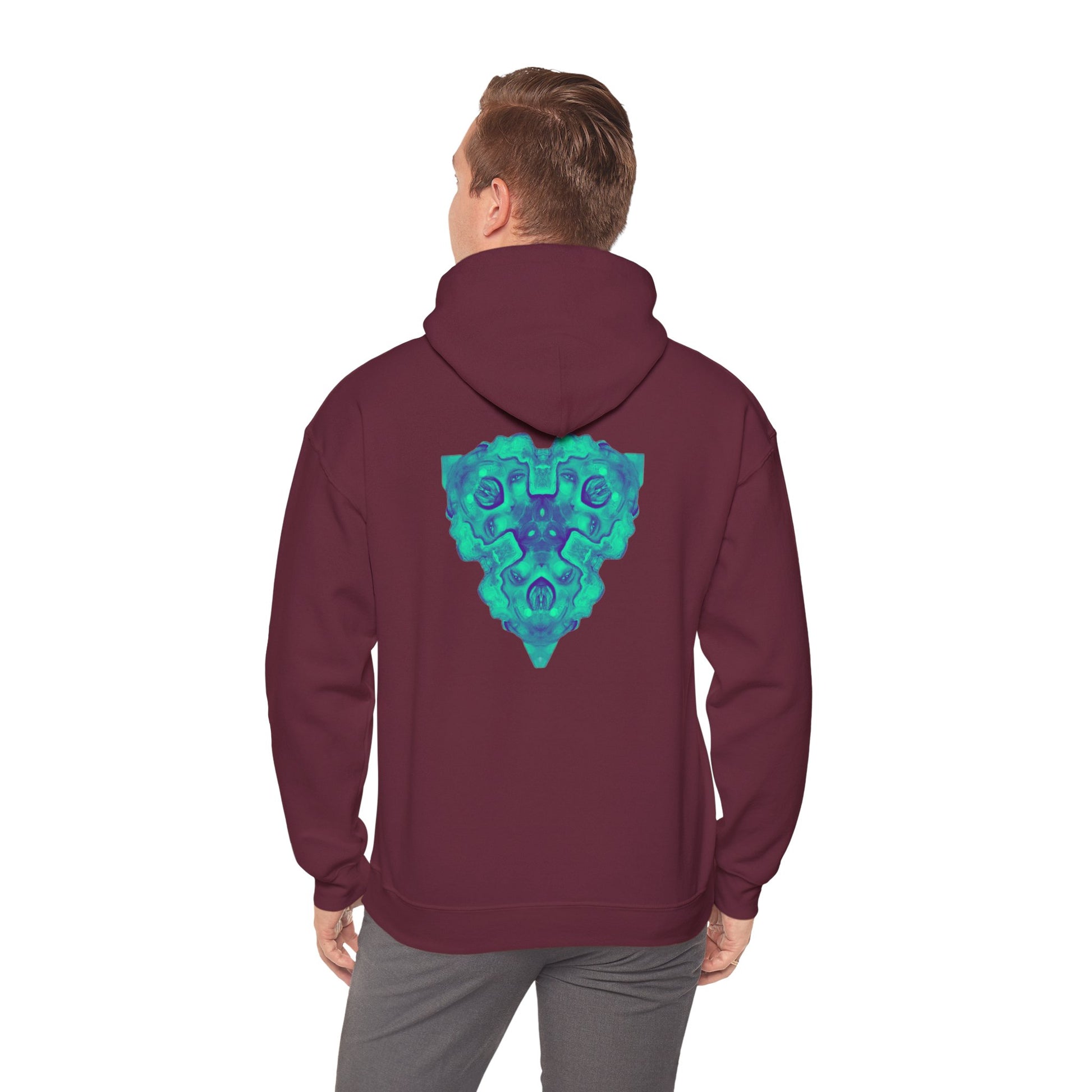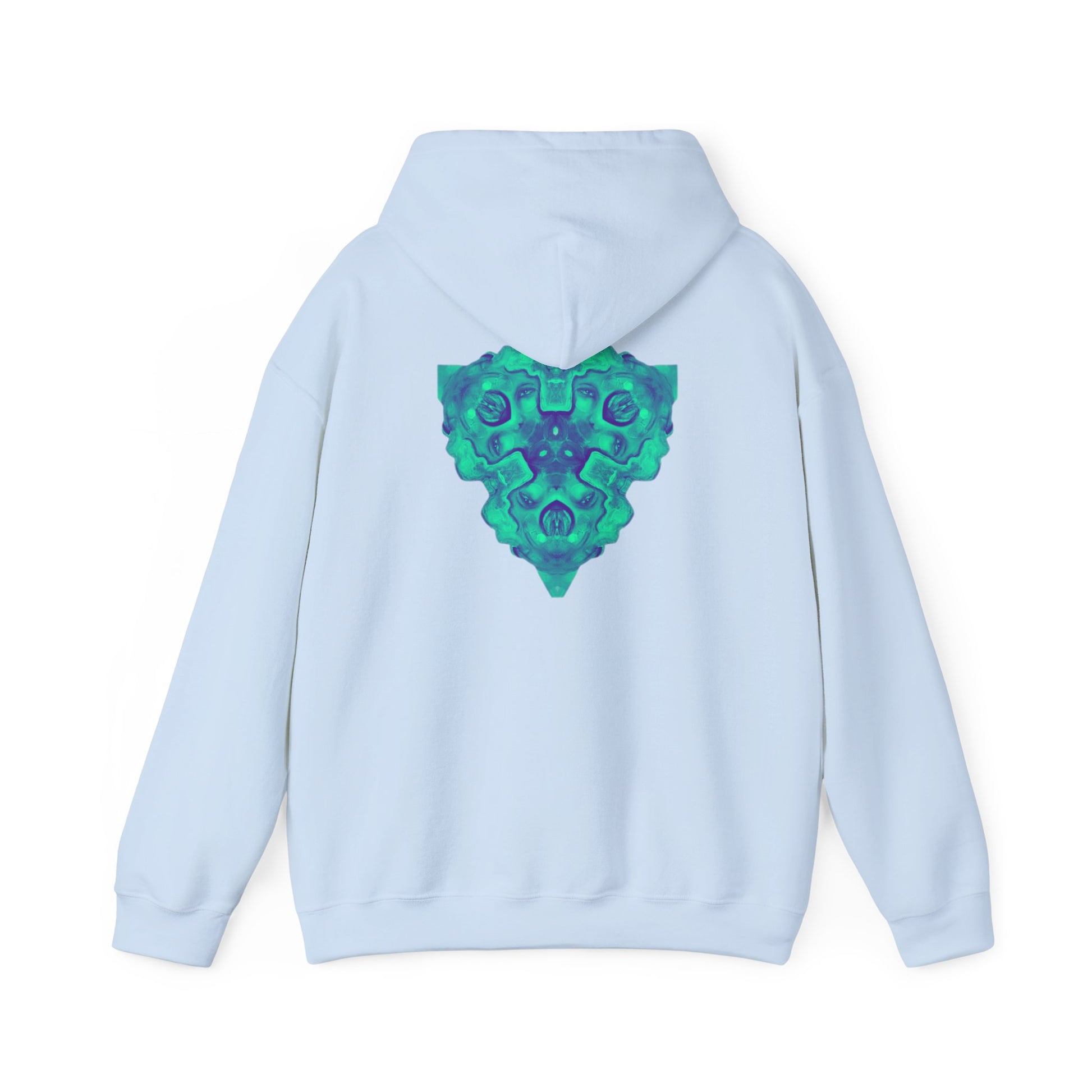 AMRU Minimal Logo Hoodie — Geometric Teal Mandala Back Graphic