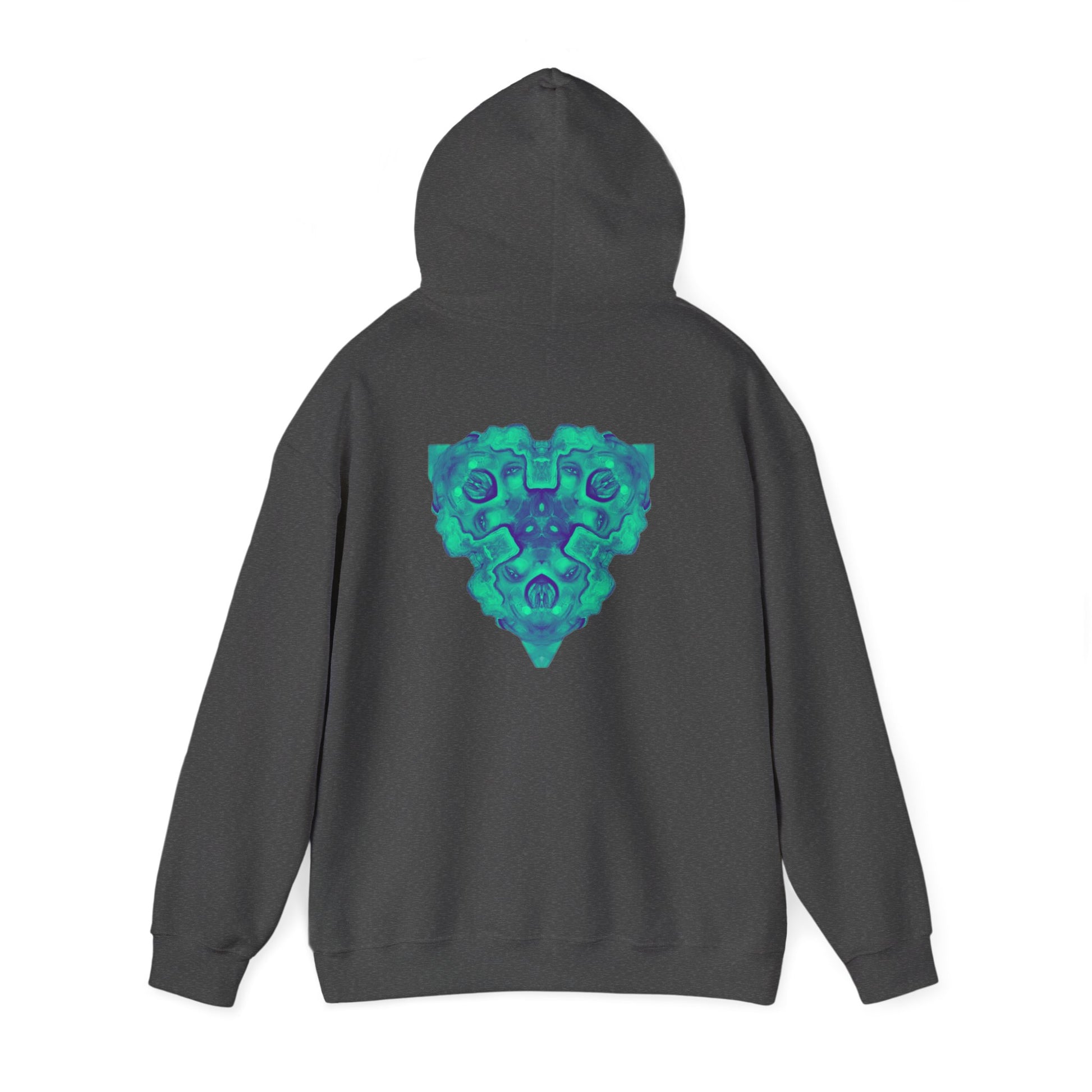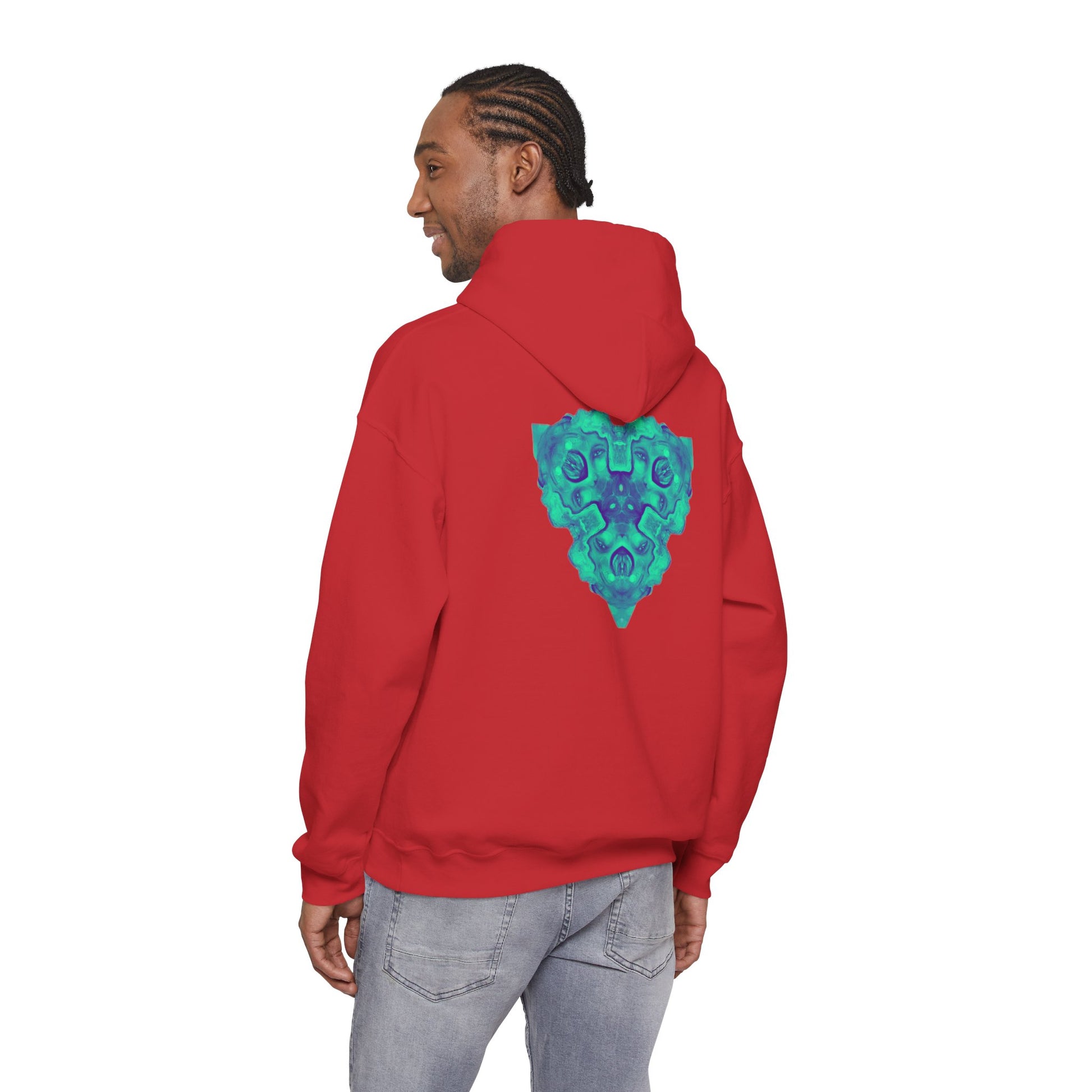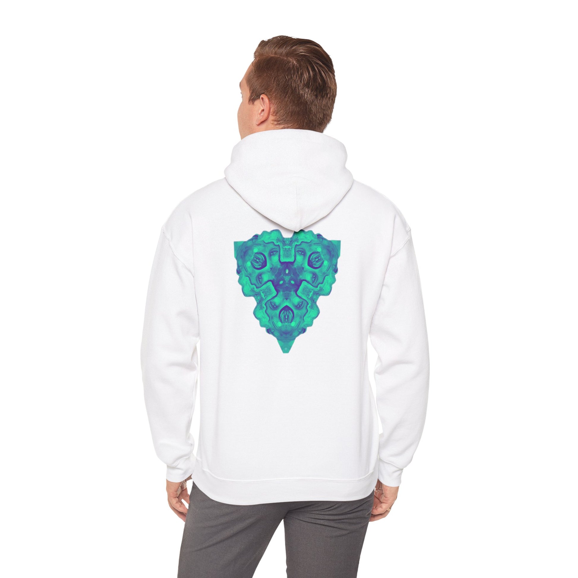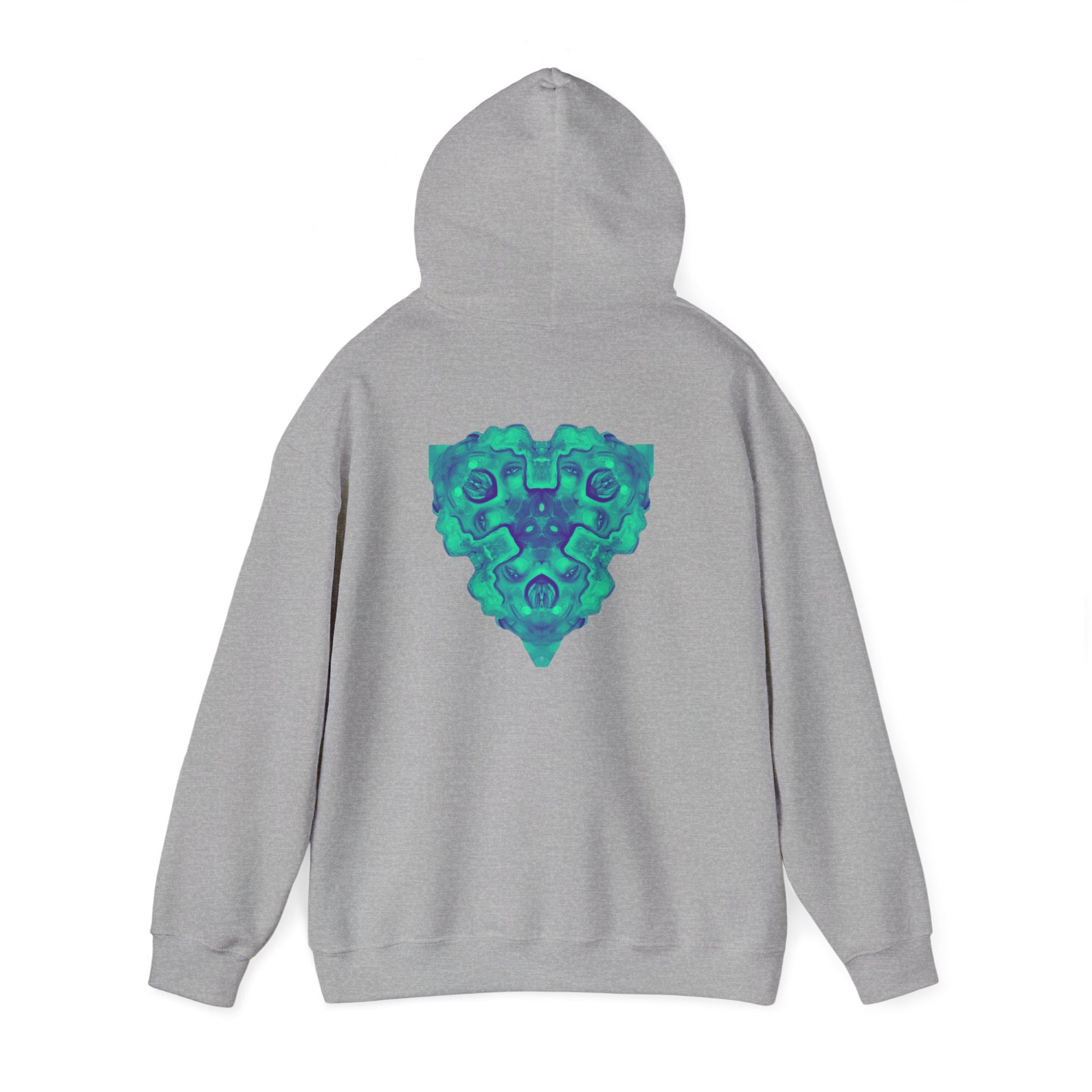 AMRU Minimal Logo Hoodie — Geometric Teal Mandala Back Graphic