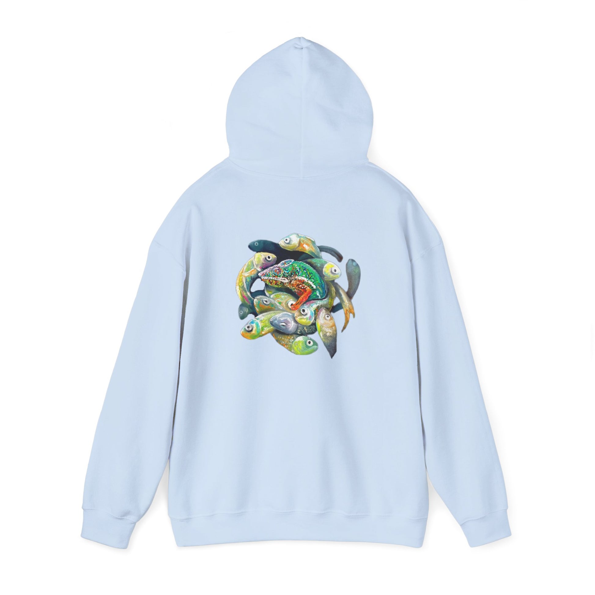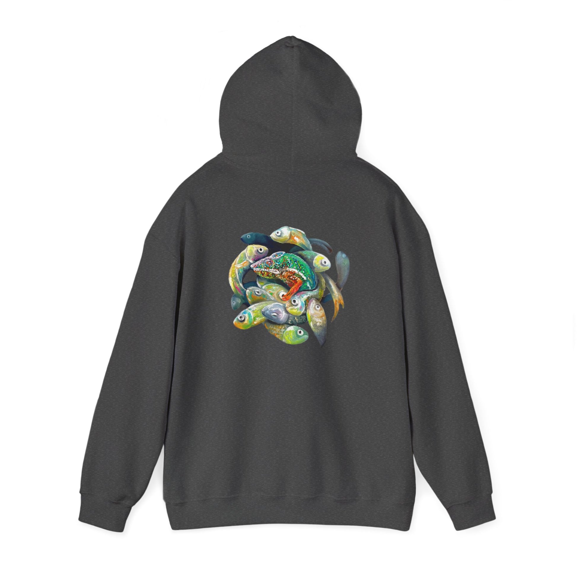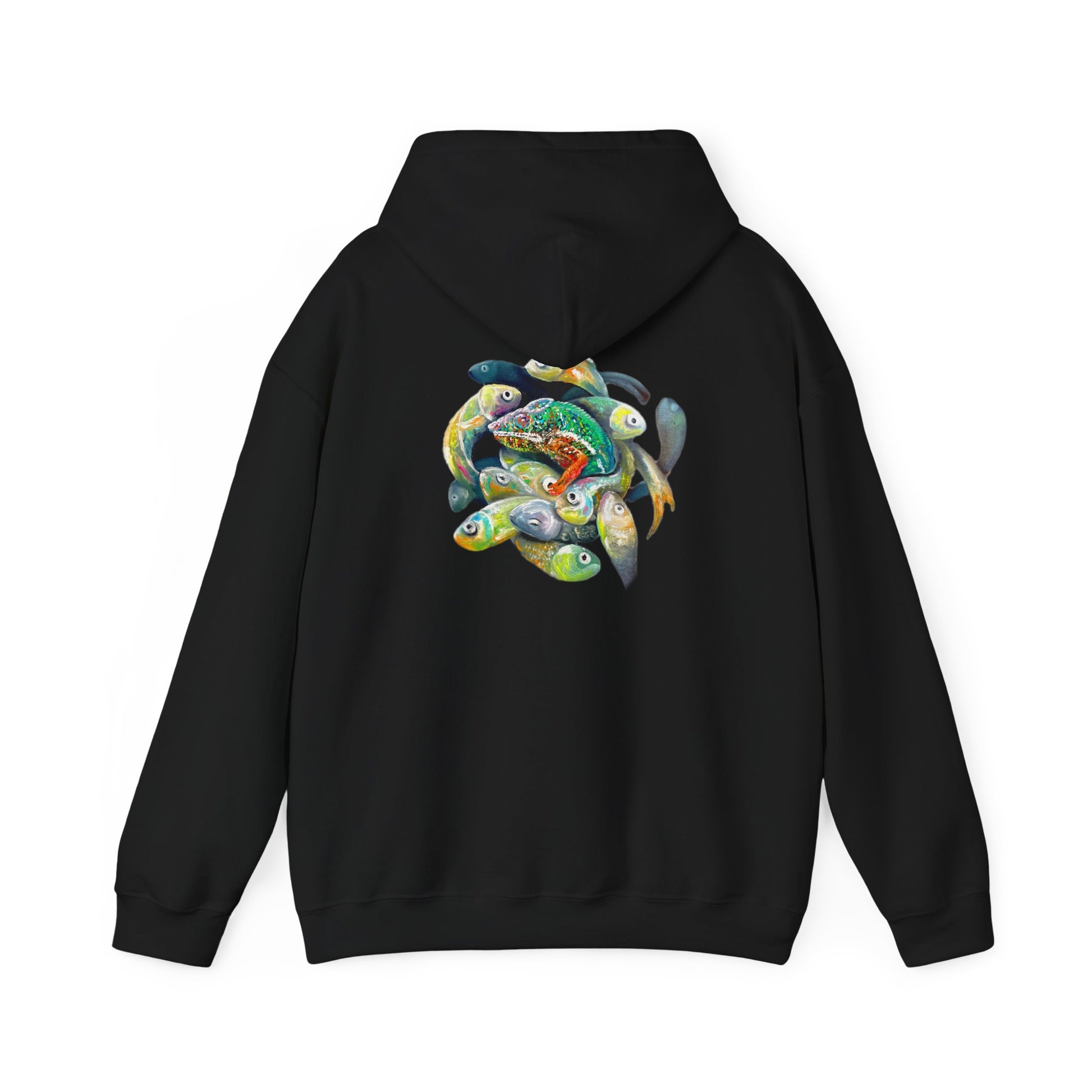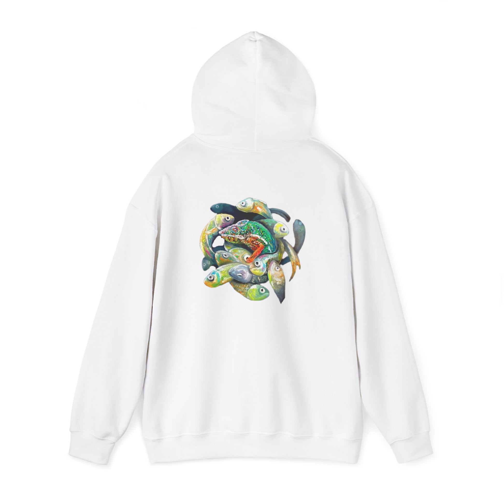 Fish Ring Hoodie – AMRU Minimal Front Logo Pullover with Colorful Koi Back Art