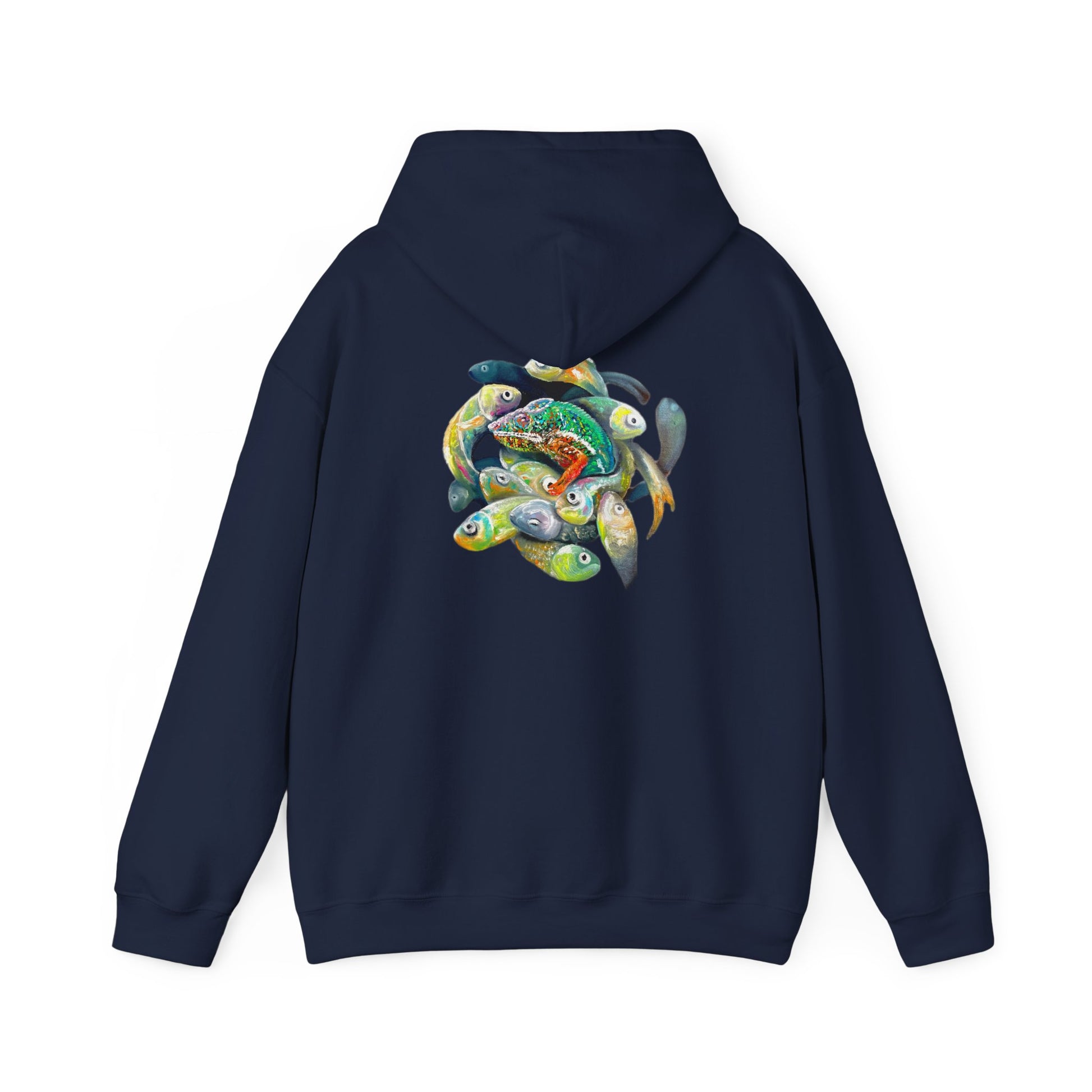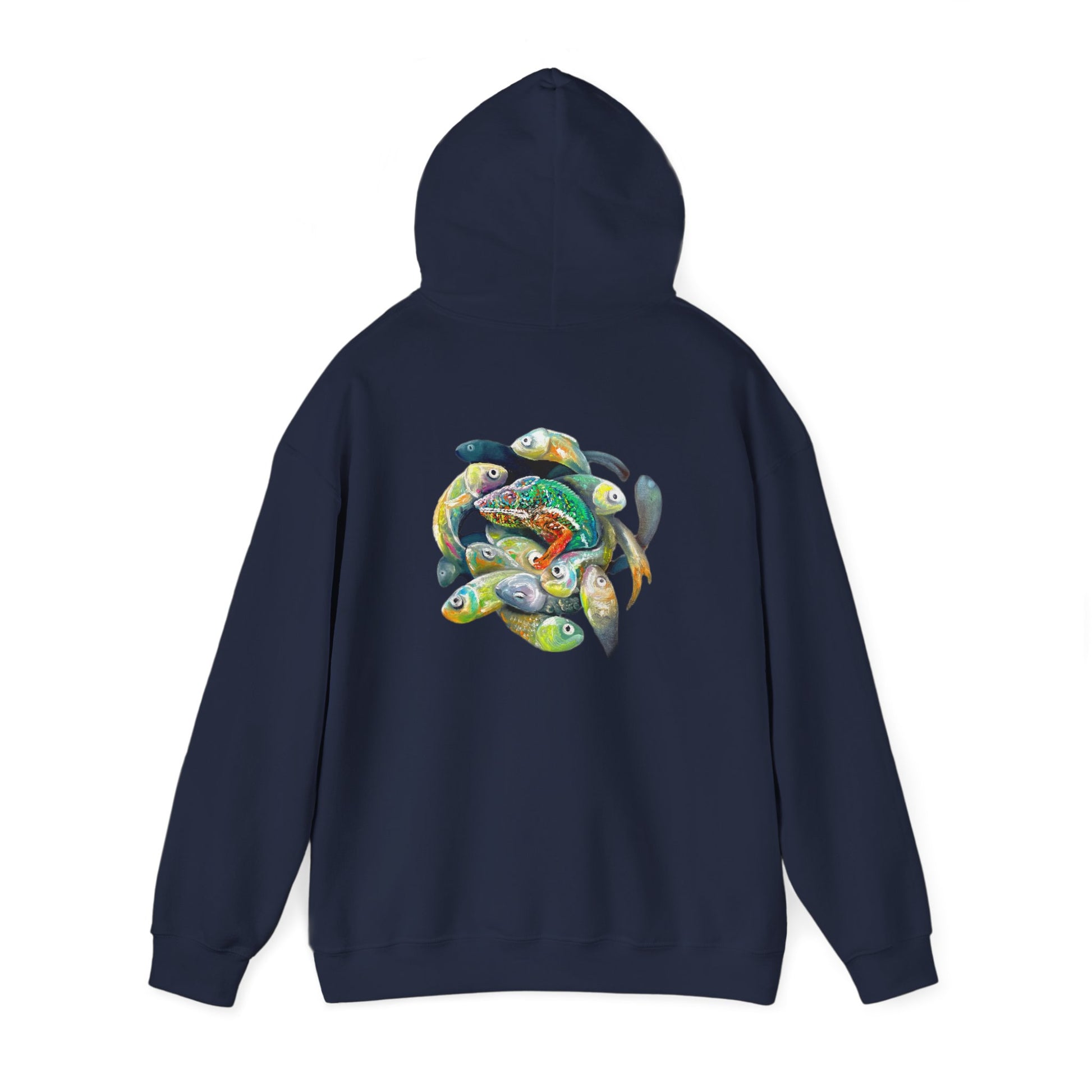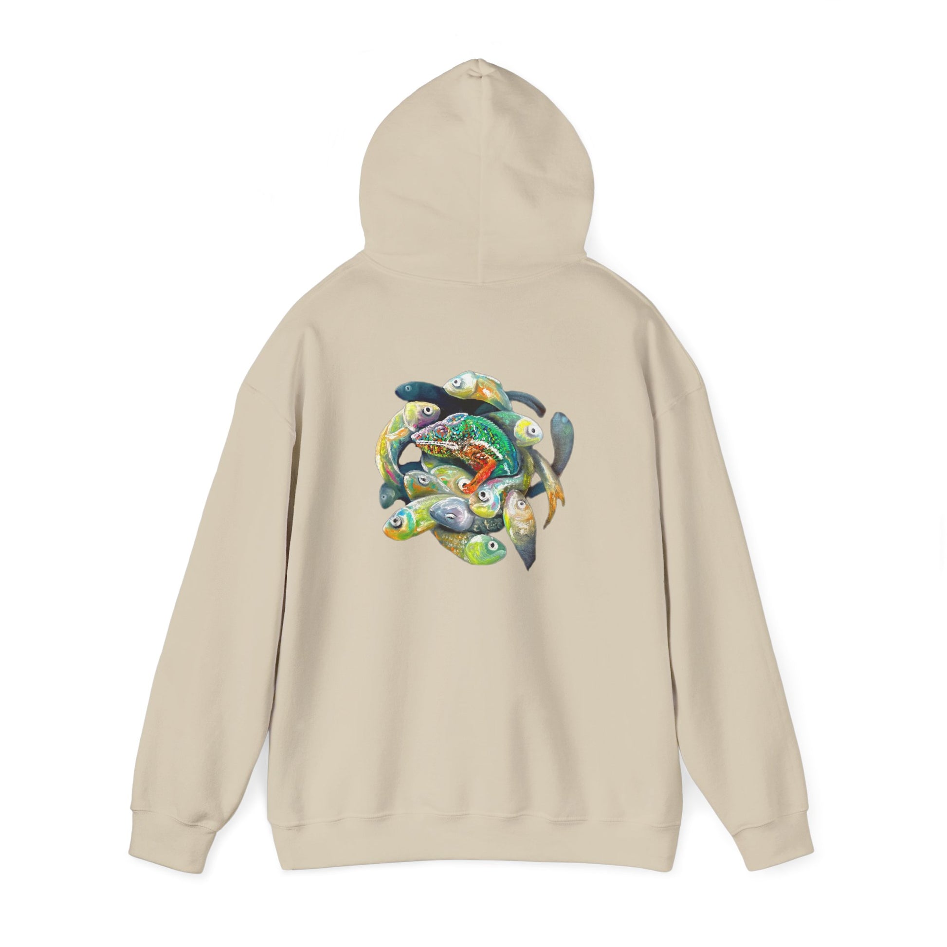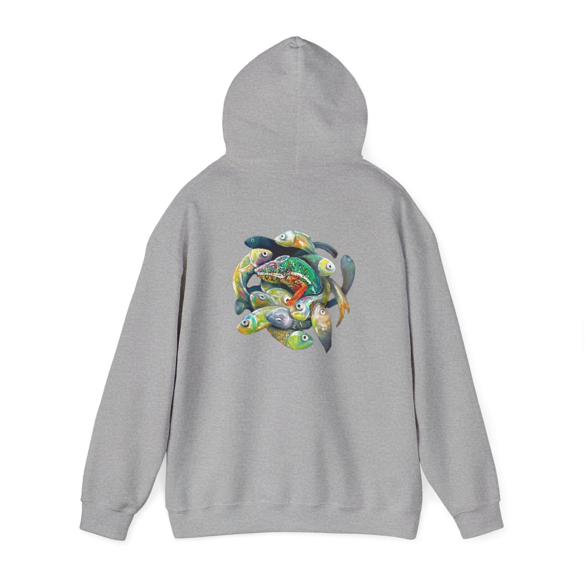 Fish Ring Hoodie – AMRU Minimal Front Logo Pullover with Colorful Koi Back Art