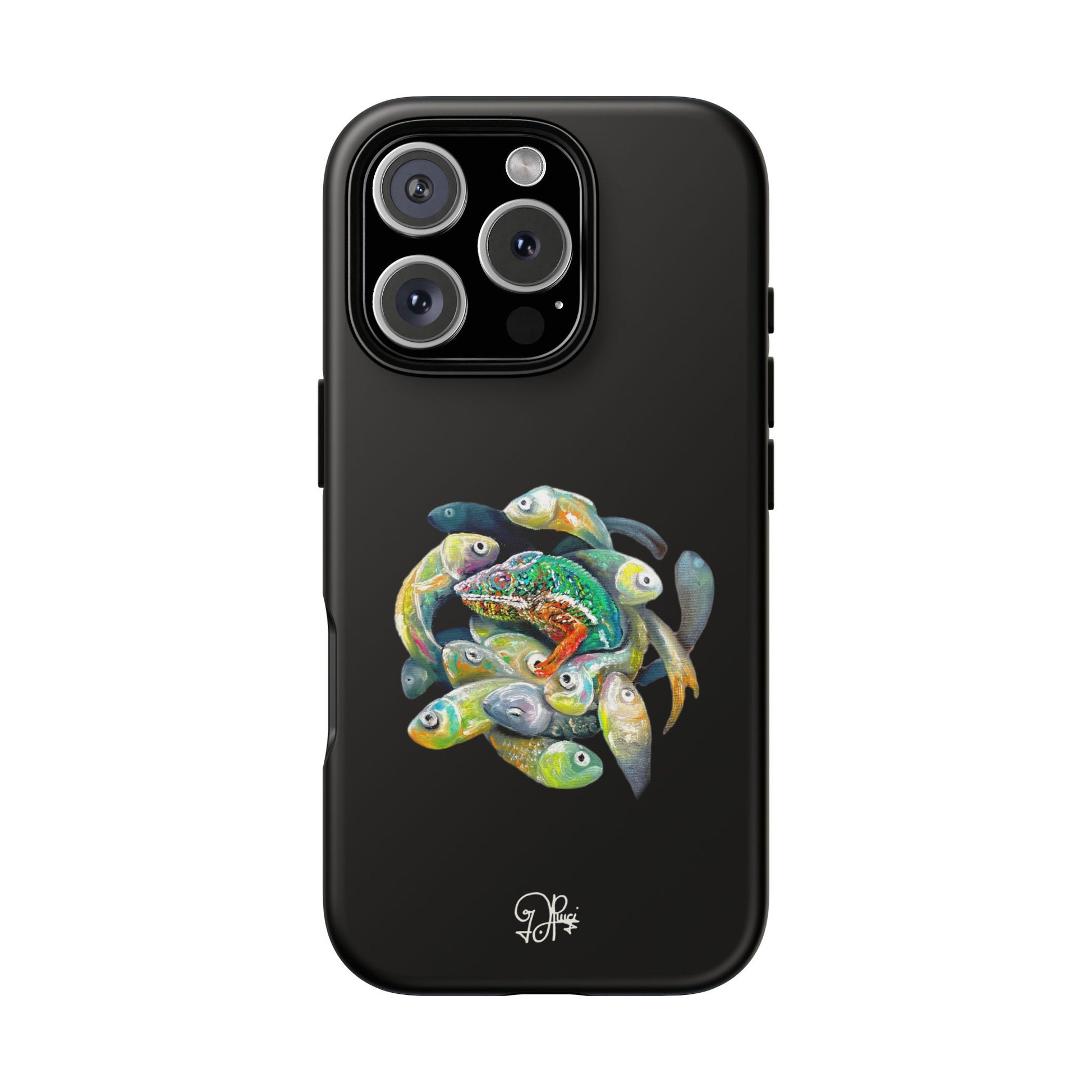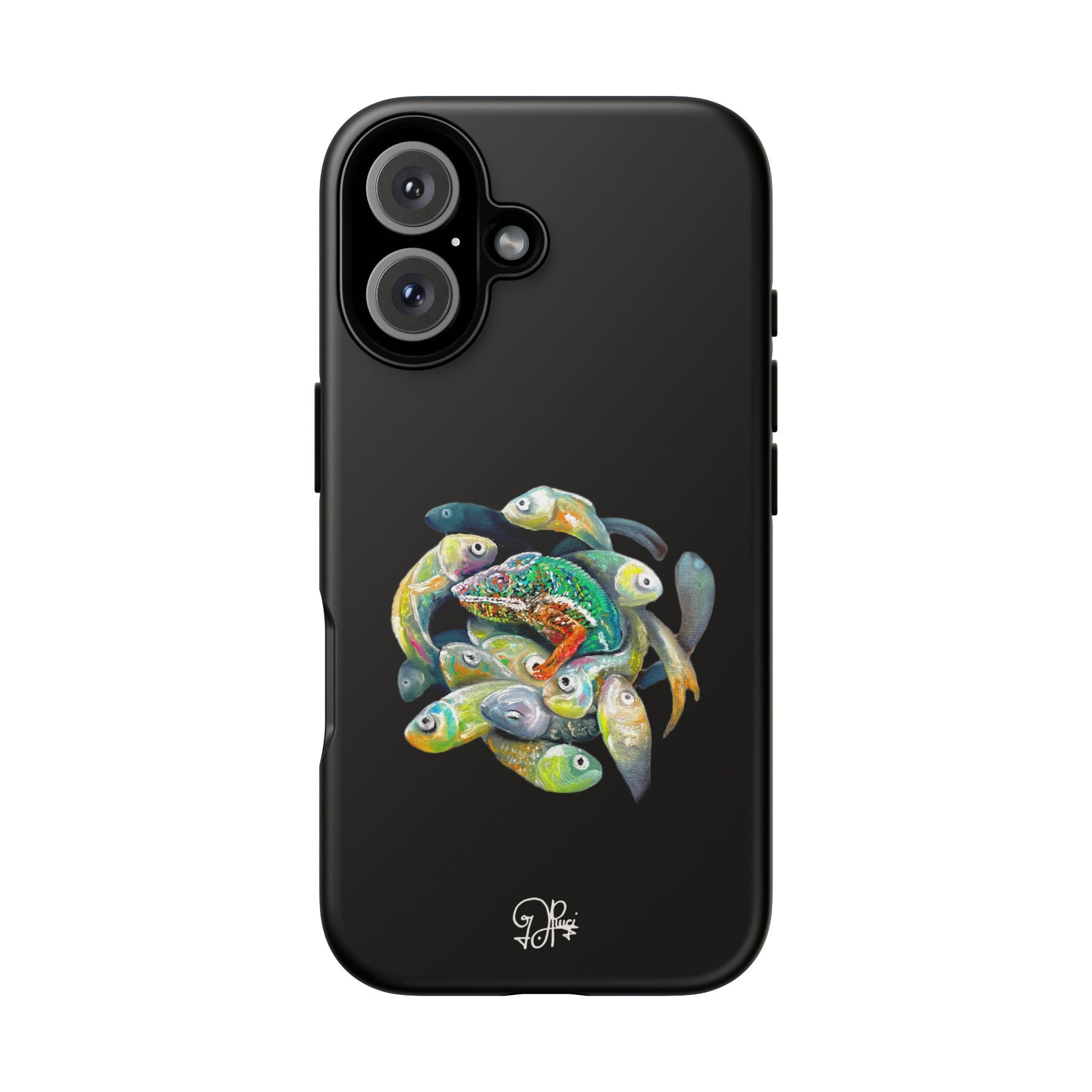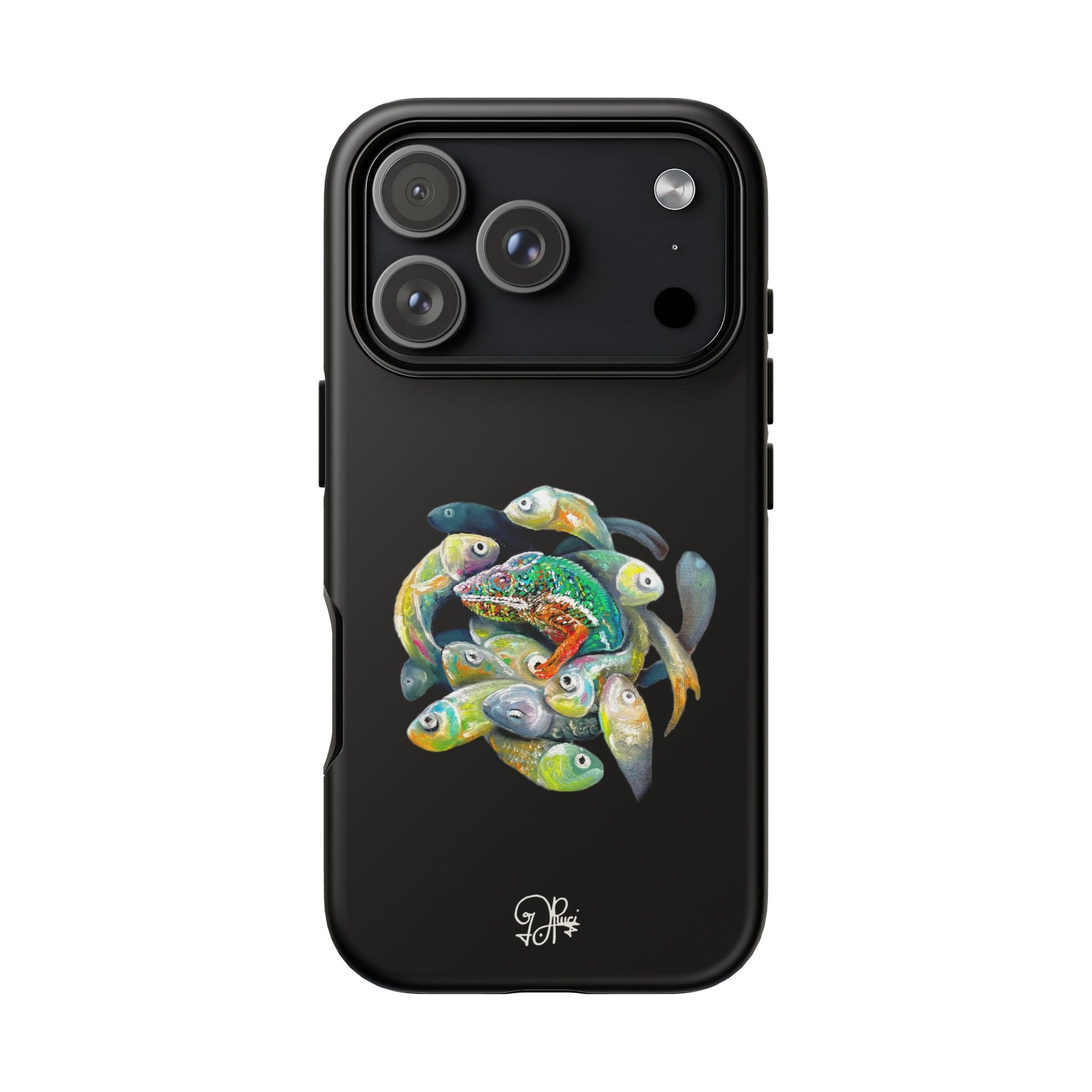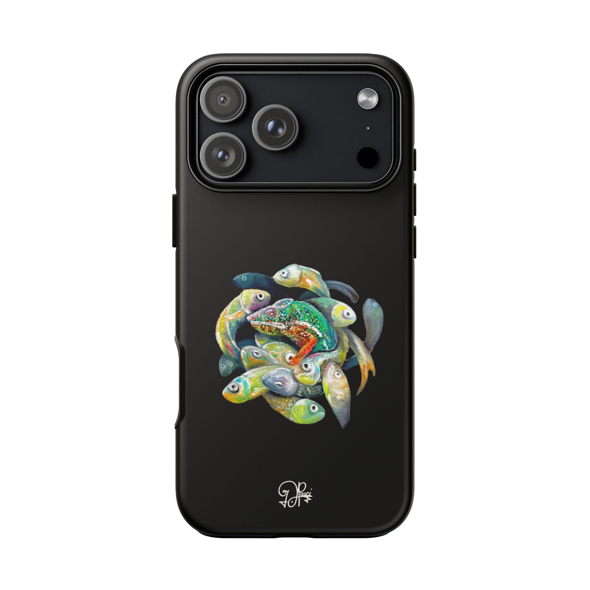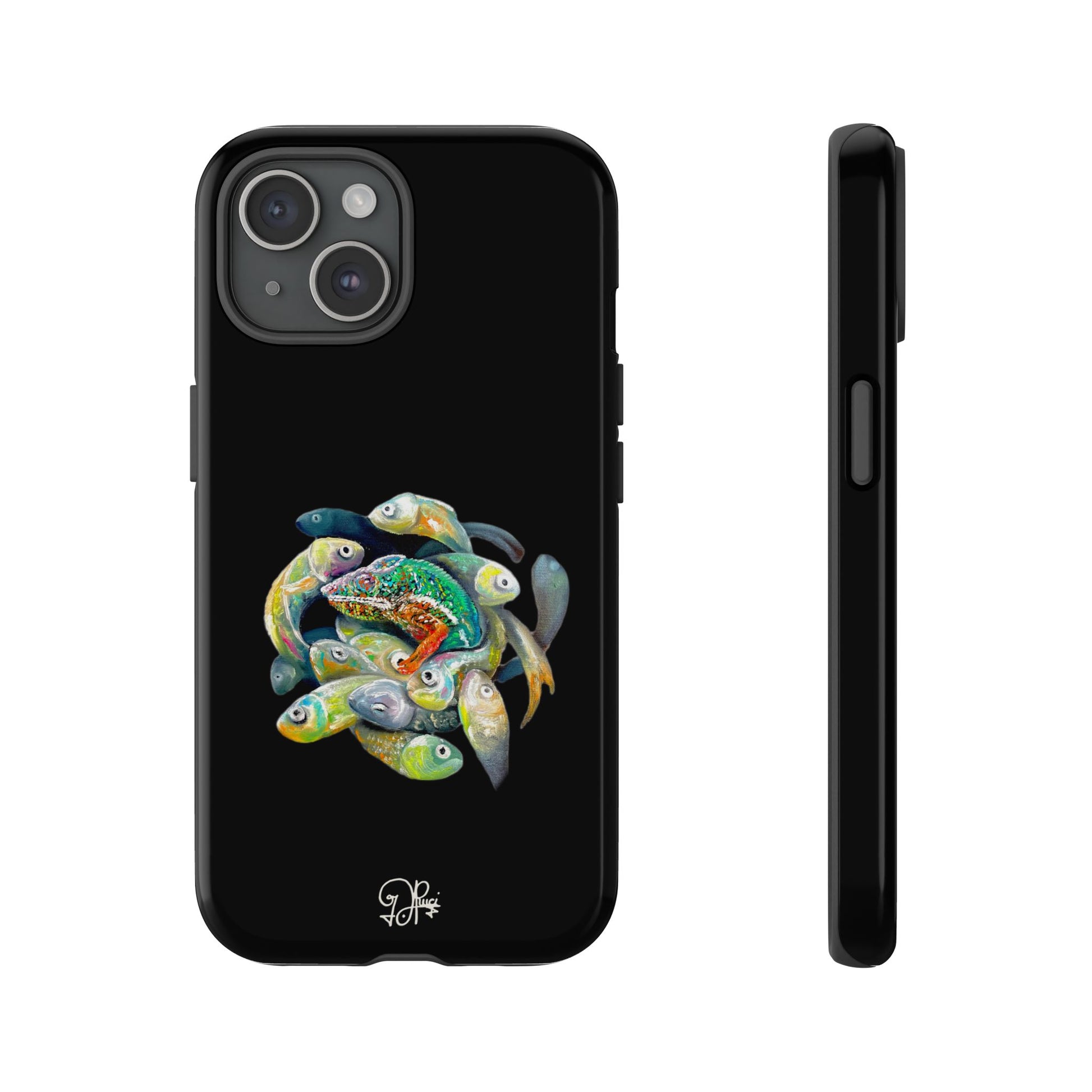 This tough phone case wraps your device in splashy, protective art. The low-profile dual-layer shell combines a rigid polycarbonate exterior with a TPU silicone liner for impact resistance and shock absorption. A vivid 3D wrap print places a colorful, swirling school of fish front-and-center against a deep black background — the colors remain vivid thanks to UV-resistant inks and sealed image transfer. Ports stay open and accessible, wireless charging works without removing the case, and you can choose glossy or matte finishes to match your style. Built to handle daily drops and knocks while keeping the artwork crisp, it’s a practical, wearable canvas for anyone who loves bold, aquatic-inspired designs.