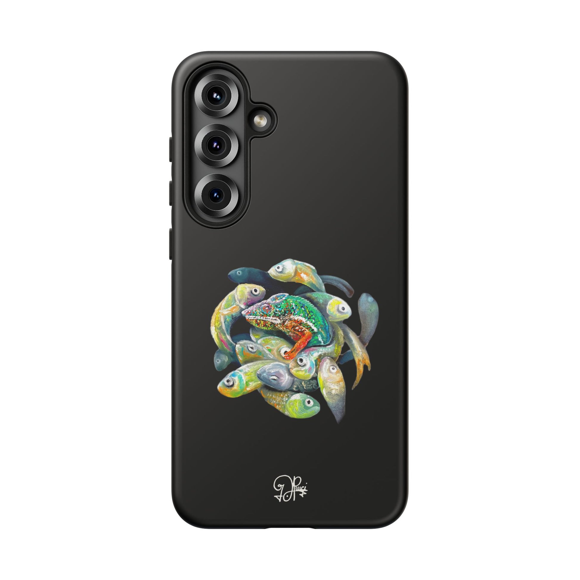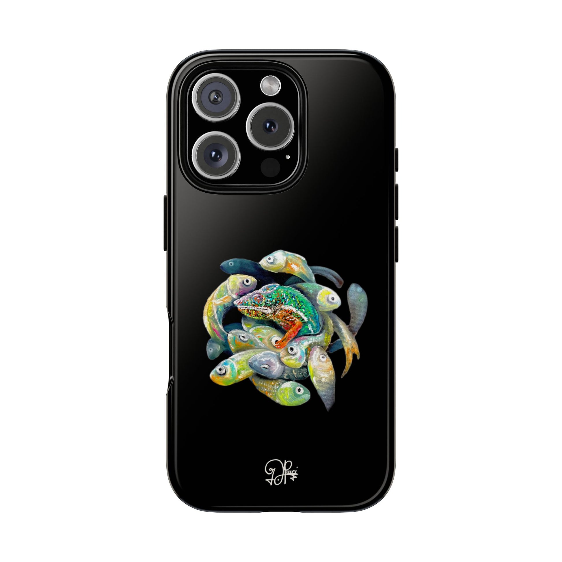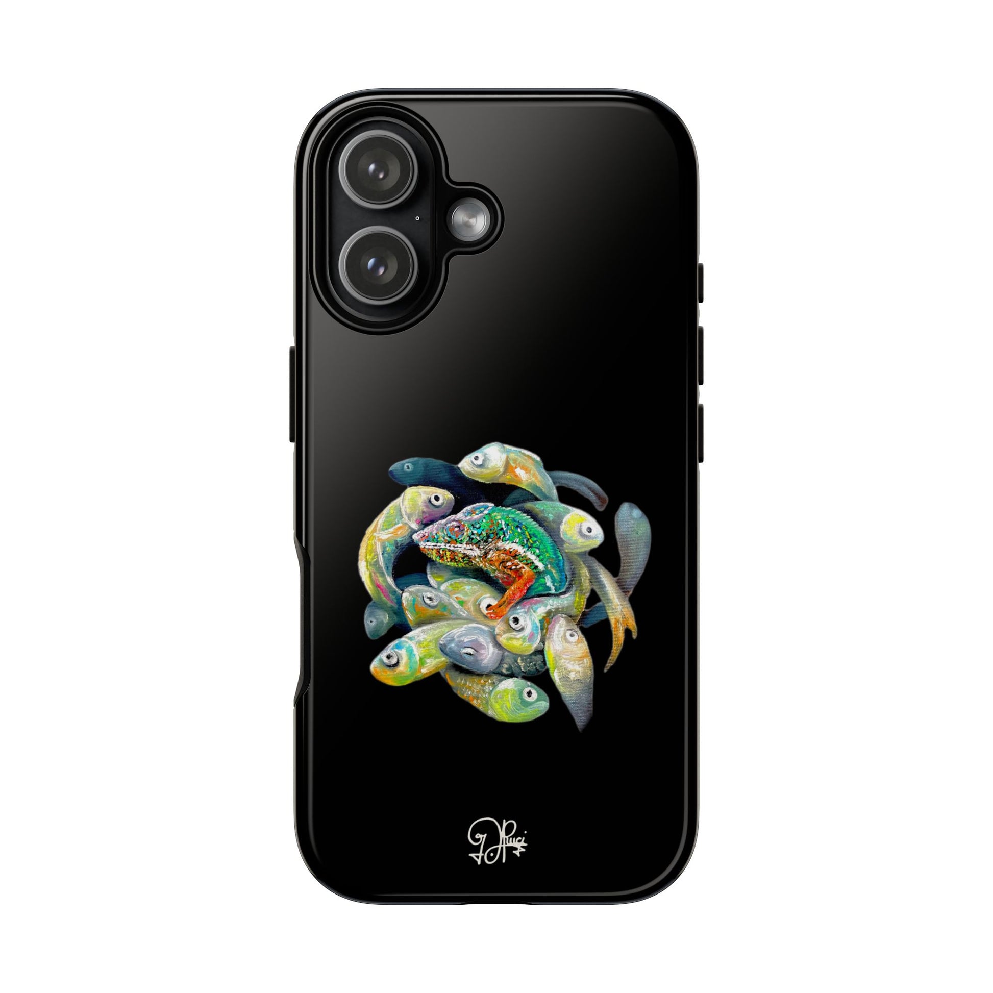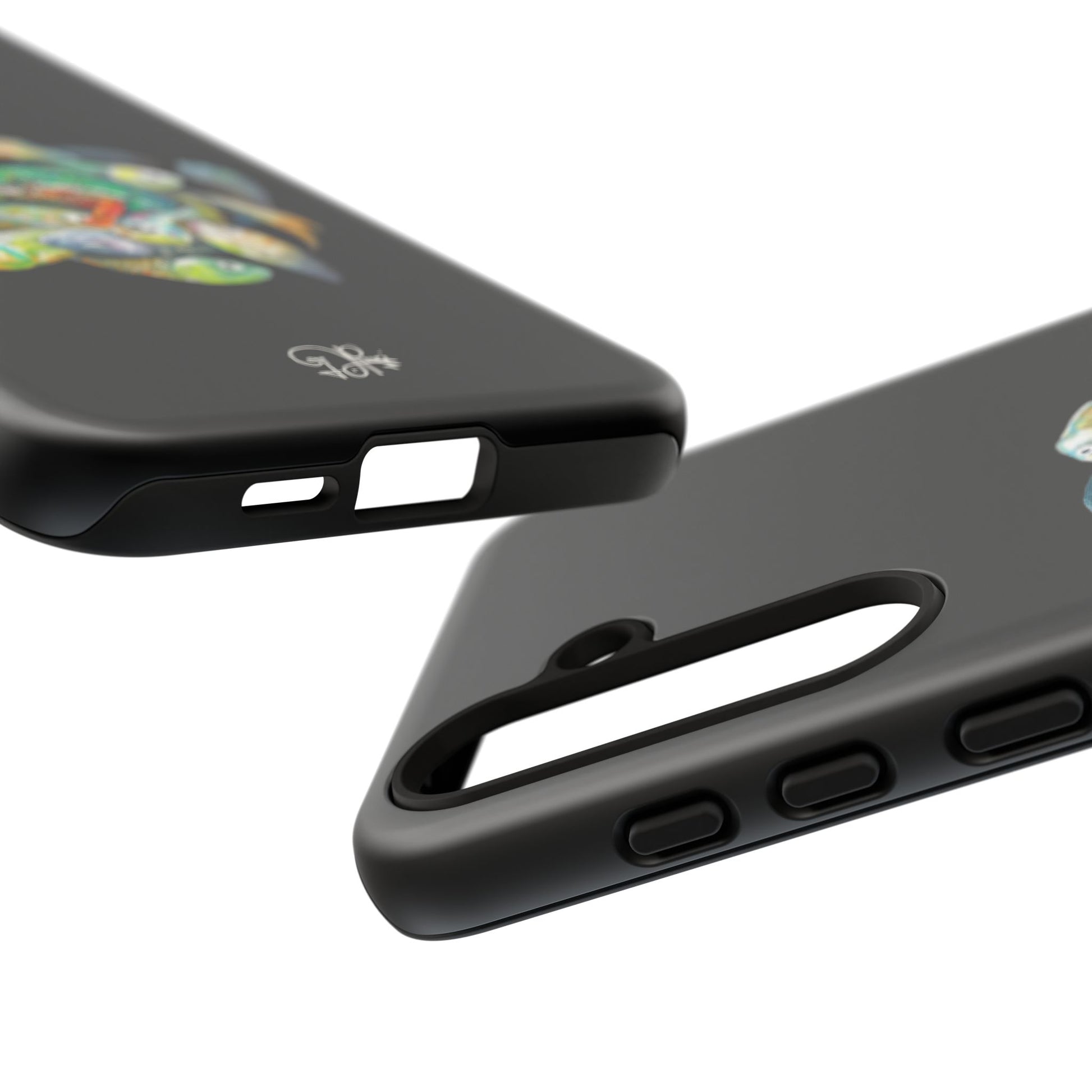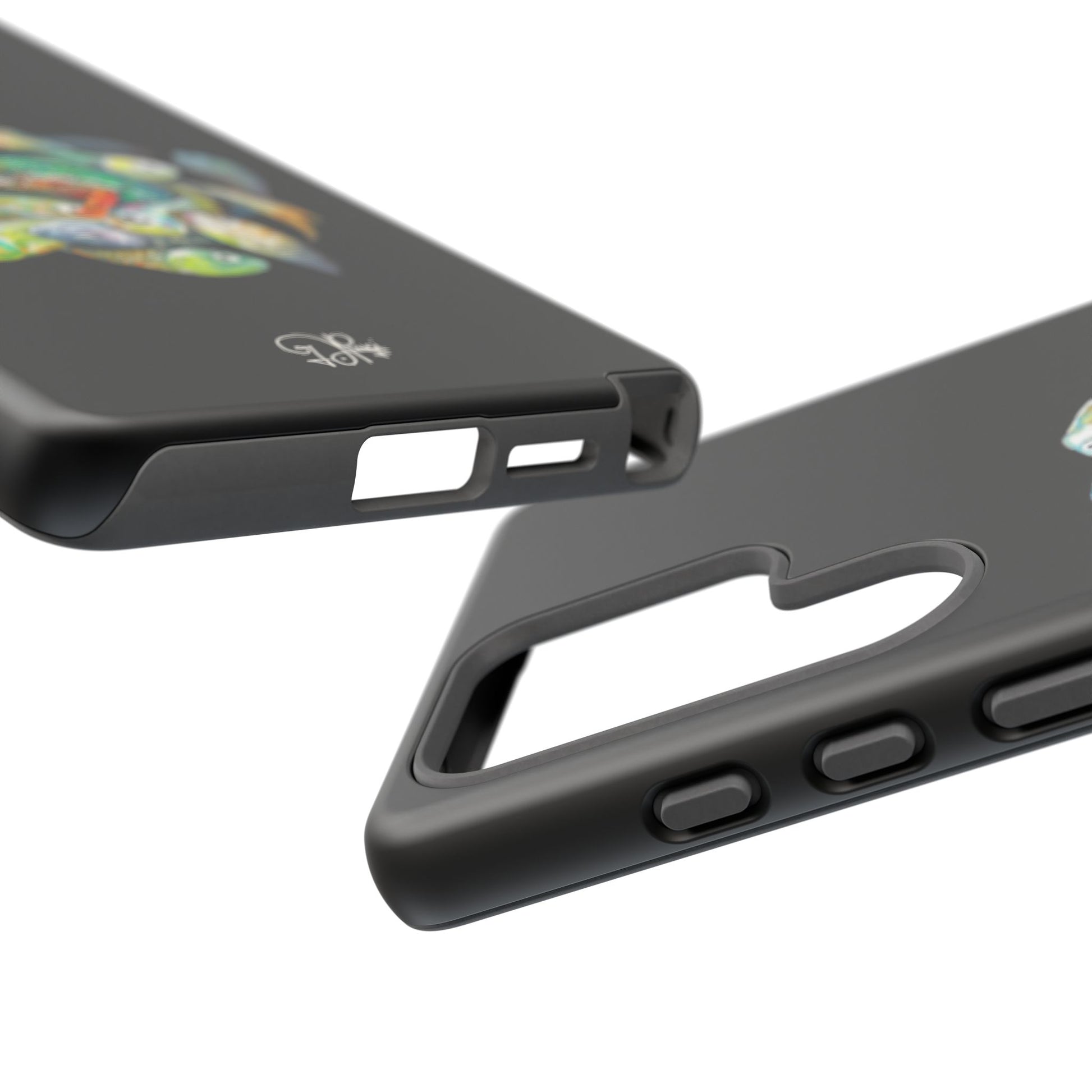 This tough phone case wraps your device in splashy, protective art. The low-profile dual-layer shell combines a rigid polycarbonate exterior with a TPU silicone liner for impact resistance and shock absorption. A vivid 3D wrap print places a colorful, swirling school of fish front-and-center against a deep black background — the colors remain vivid thanks to UV-resistant inks and sealed image transfer. Ports stay open and accessible, wireless charging works without removing the case, and you can choose glossy or matte finishes to match your style. Built to handle daily drops and knocks while keeping the artwork crisp, it’s a practical, wearable canvas for anyone who loves bold, aquatic-inspired designs.