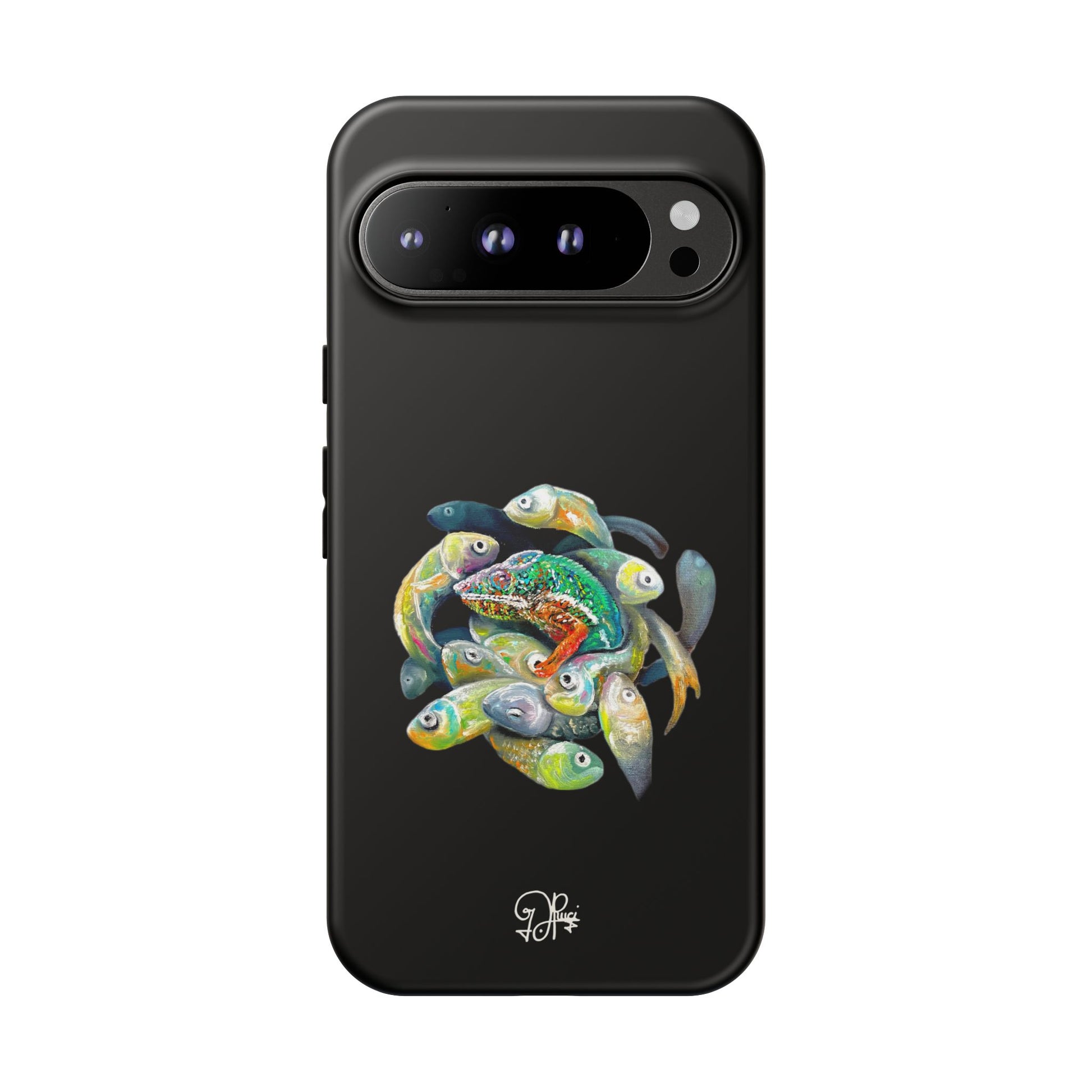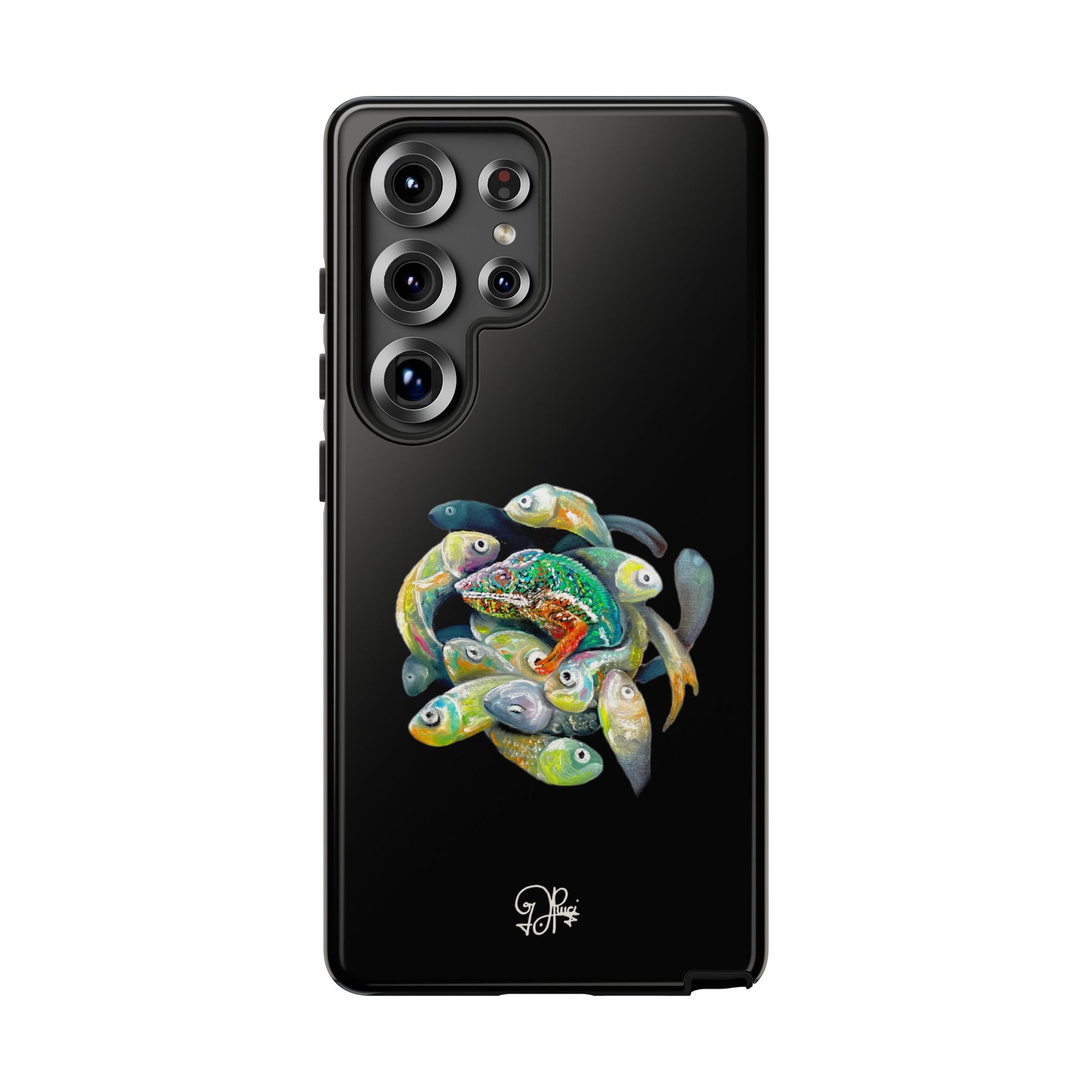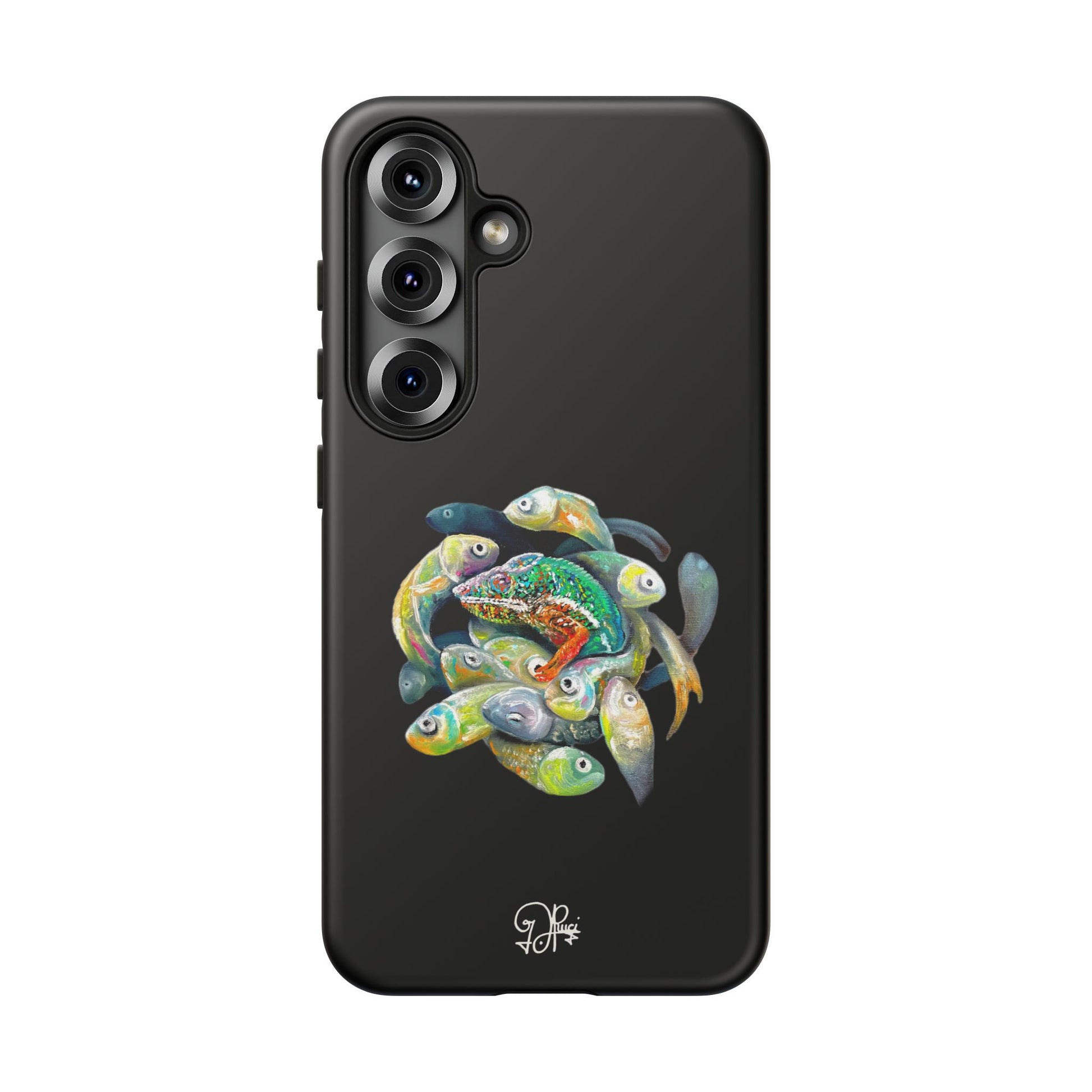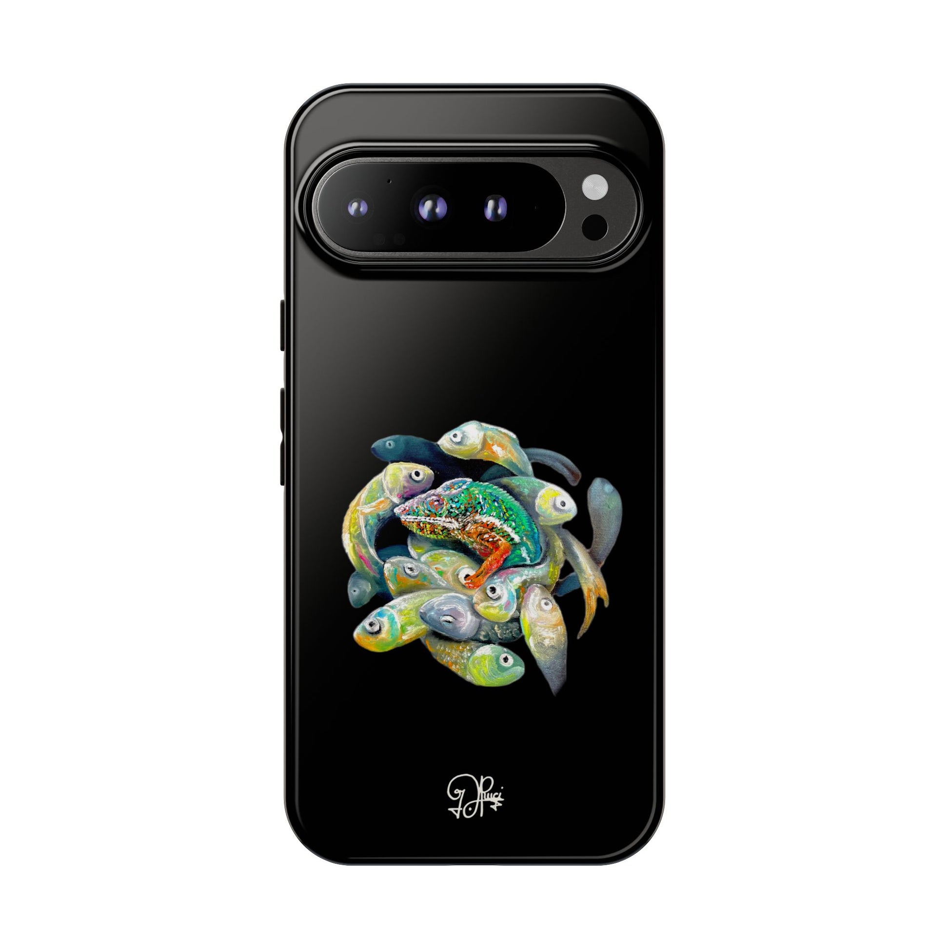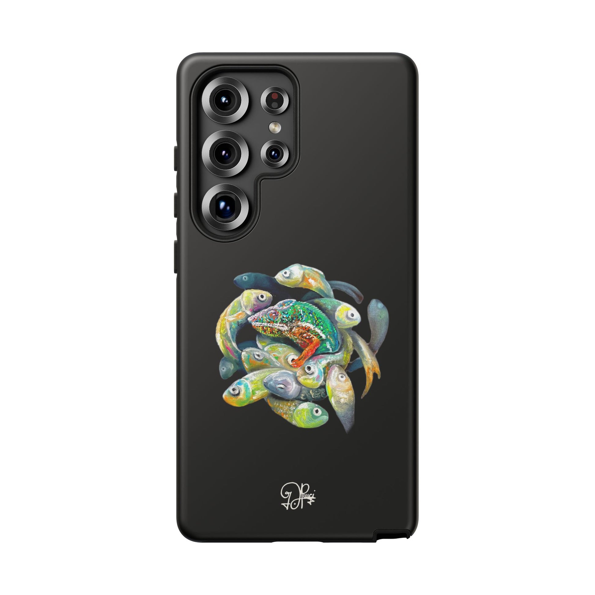 This tough phone case wraps your device in splashy, protective art. The low-profile dual-layer shell combines a rigid polycarbonate exterior with a TPU silicone liner for impact resistance and shock absorption. A vivid 3D wrap print places a colorful, swirling school of fish front-and-center against a deep black background — the colors remain vivid thanks to UV-resistant inks and sealed image transfer. Ports stay open and accessible, wireless charging works without removing the case, and you can choose glossy or matte finishes to match your style. Built to handle daily drops and knocks while keeping the artwork crisp, it’s a practical, wearable canvas for anyone who loves bold, aquatic-inspired designs.