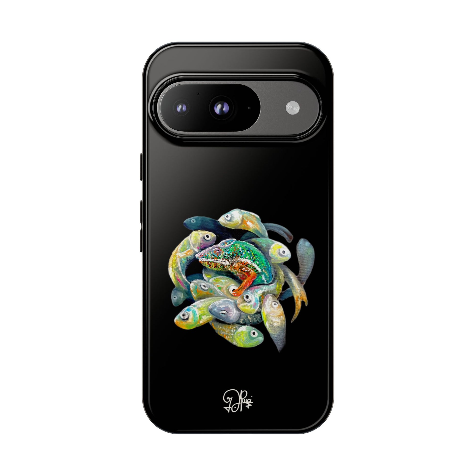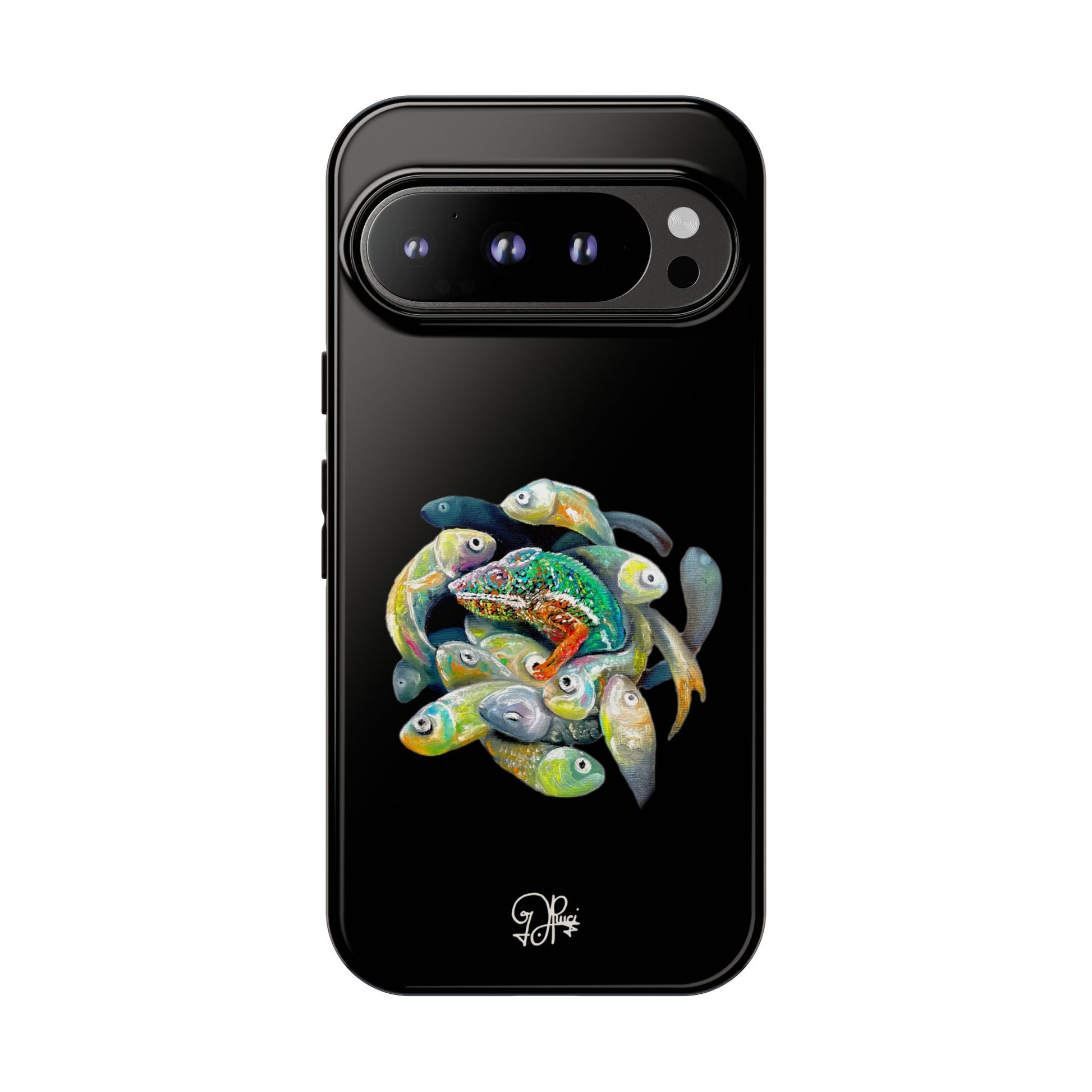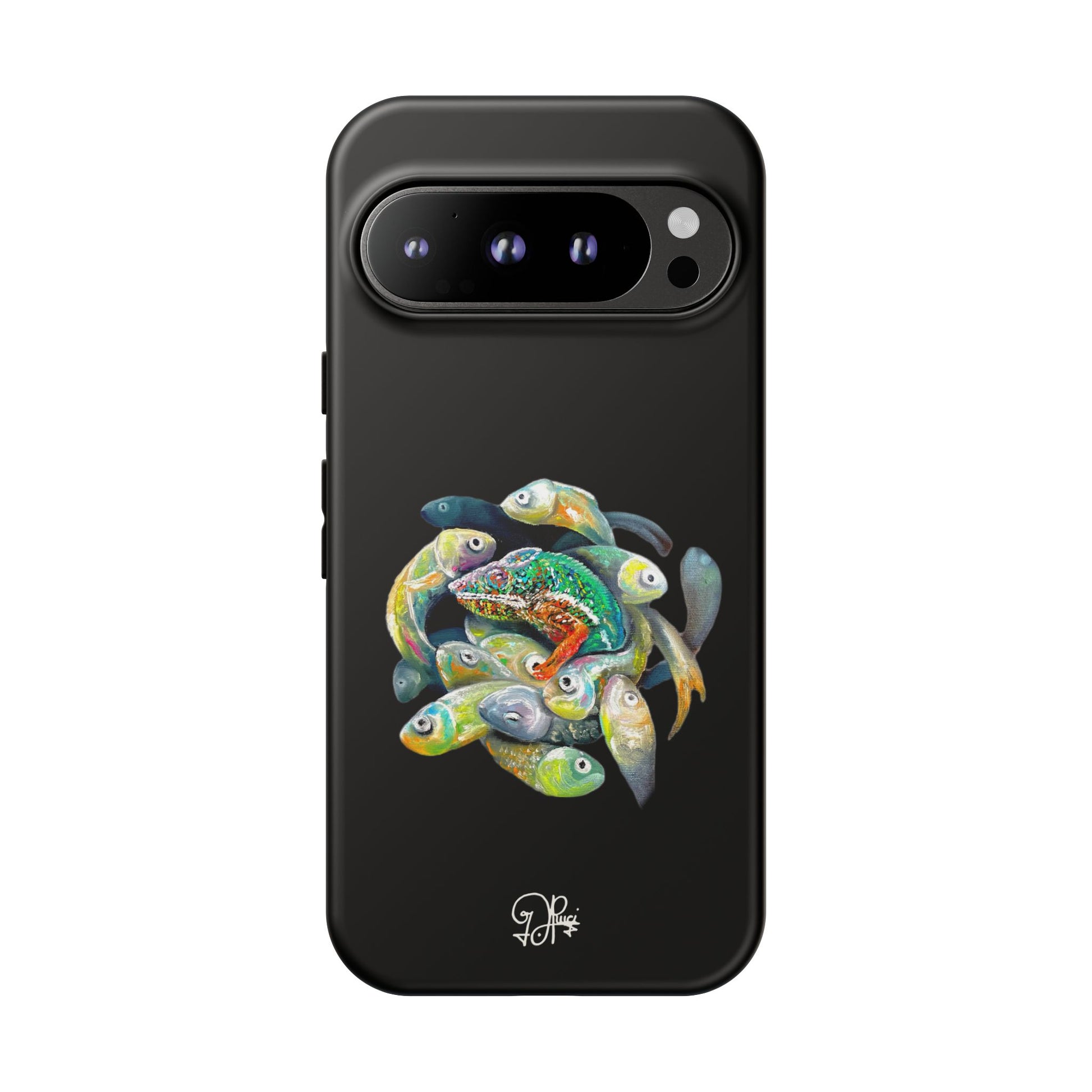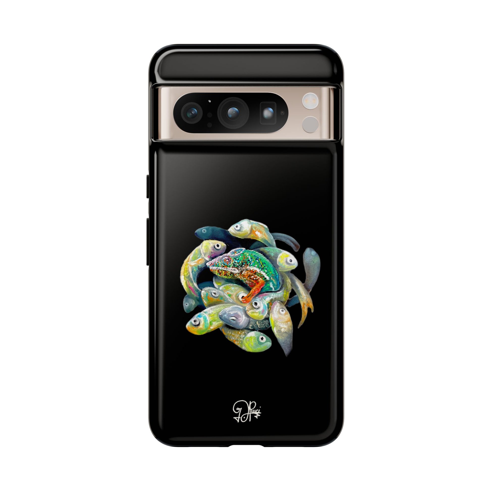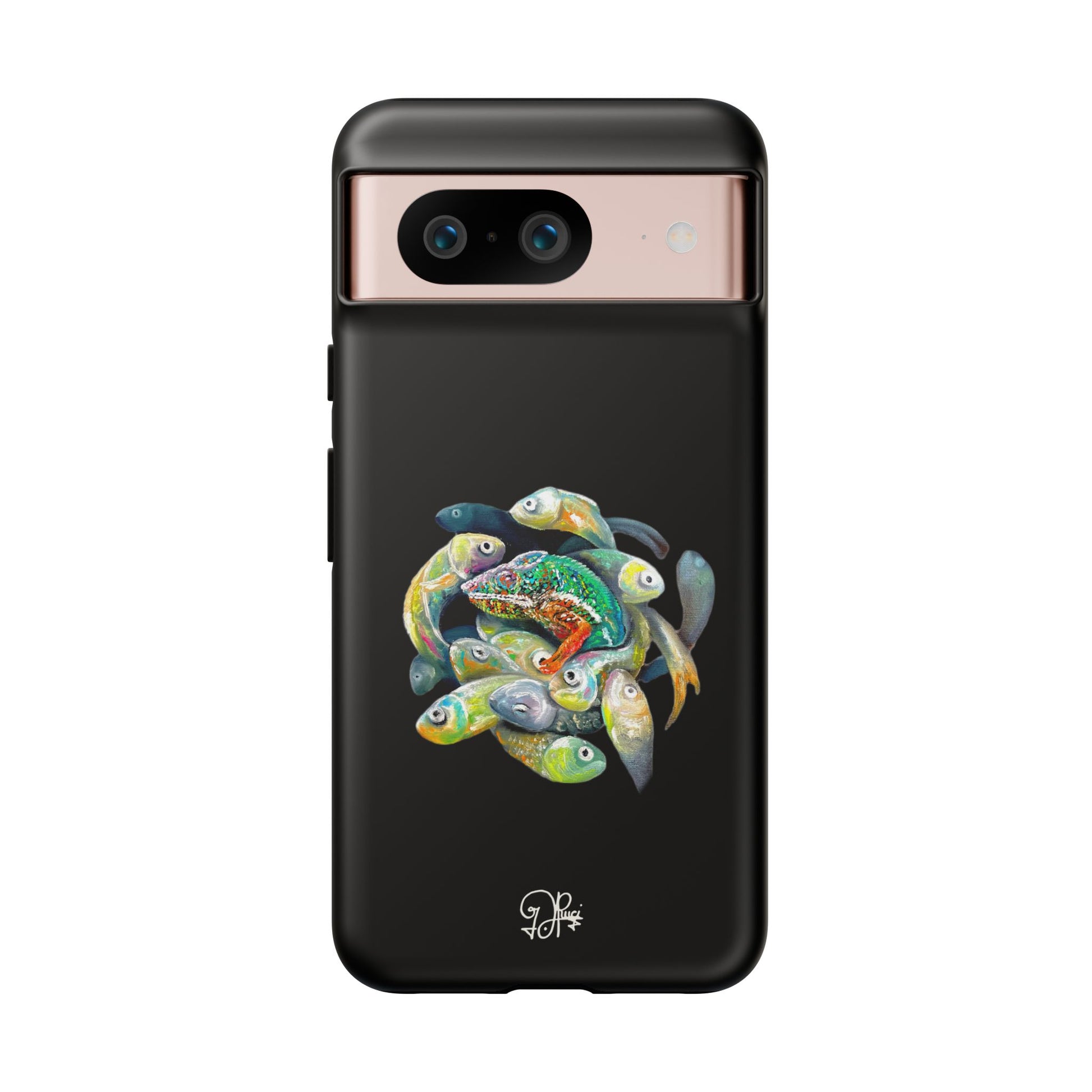 This tough phone case wraps your device in splashy, protective art. The low-profile dual-layer shell combines a rigid polycarbonate exterior with a TPU silicone liner for impact resistance and shock absorption. A vivid 3D wrap print places a colorful, swirling school of fish front-and-center against a deep black background — the colors remain vivid thanks to UV-resistant inks and sealed image transfer. Ports stay open and accessible, wireless charging works without removing the case, and you can choose glossy or matte finishes to match your style. Built to handle daily drops and knocks while keeping the artwork crisp, it’s a practical, wearable canvas for anyone who loves bold, aquatic-inspired designs.