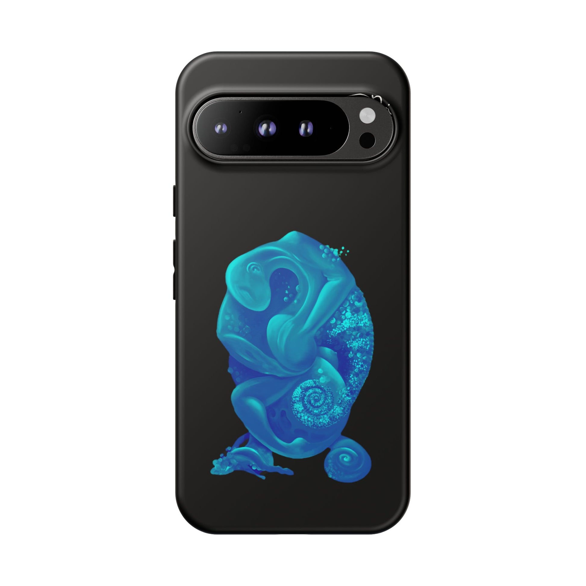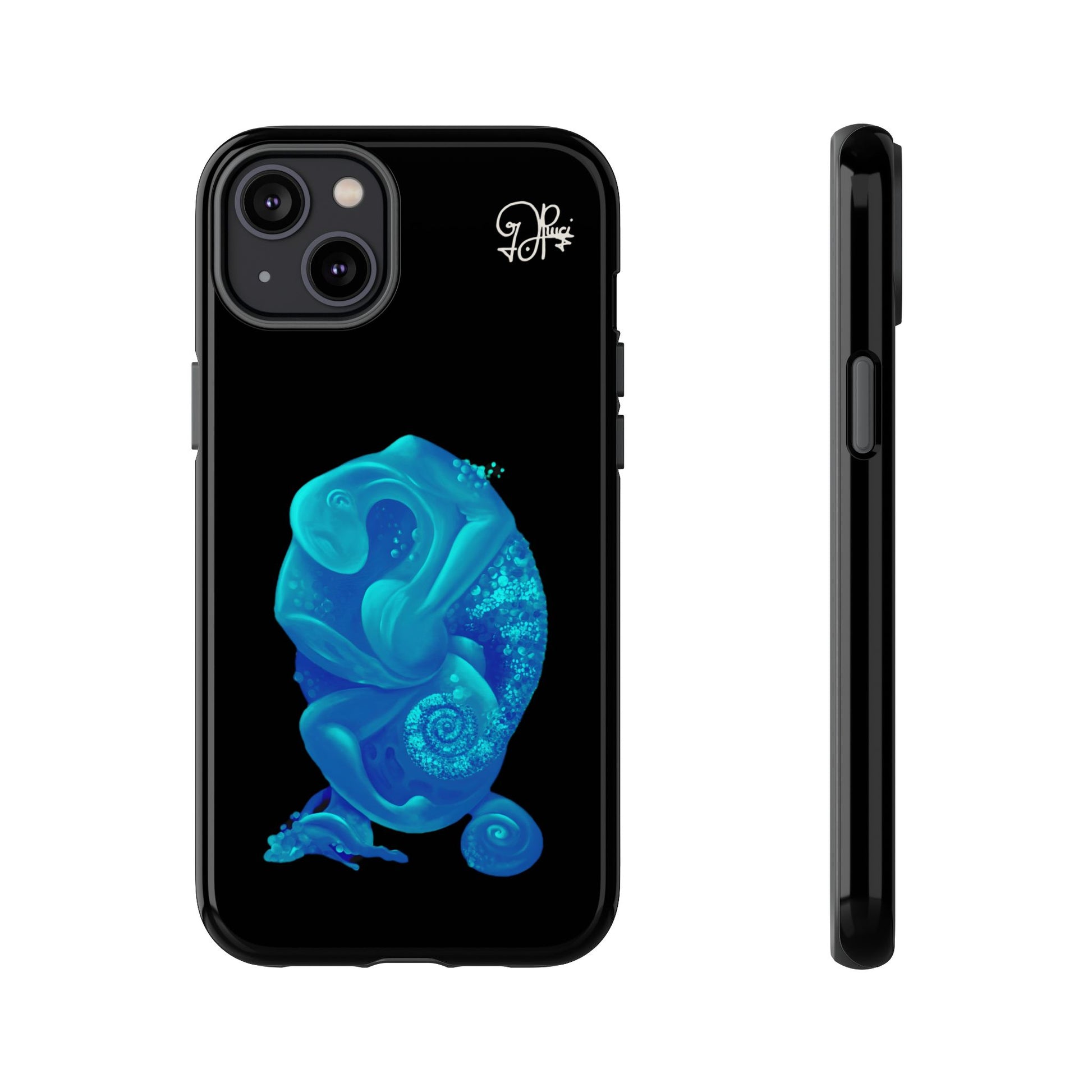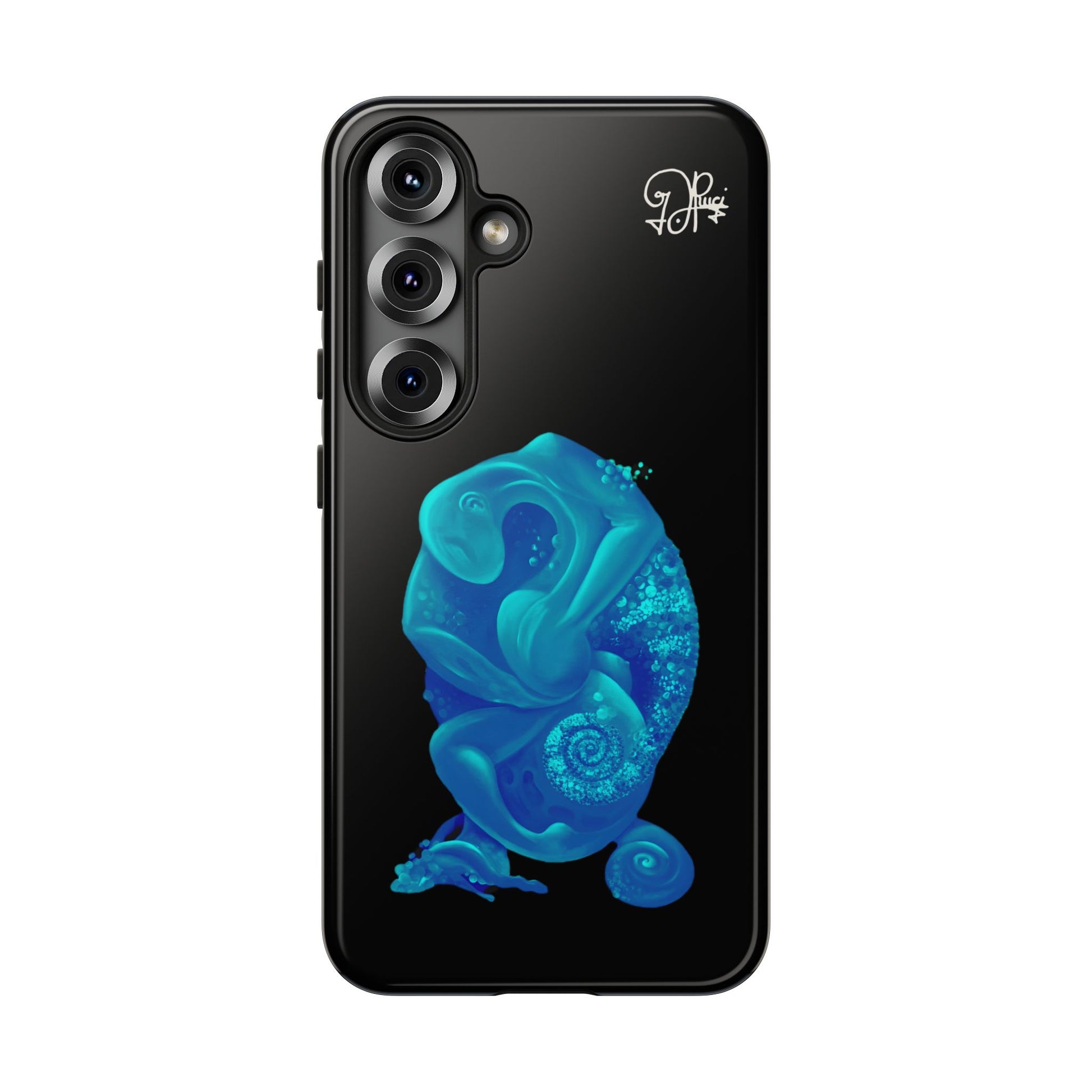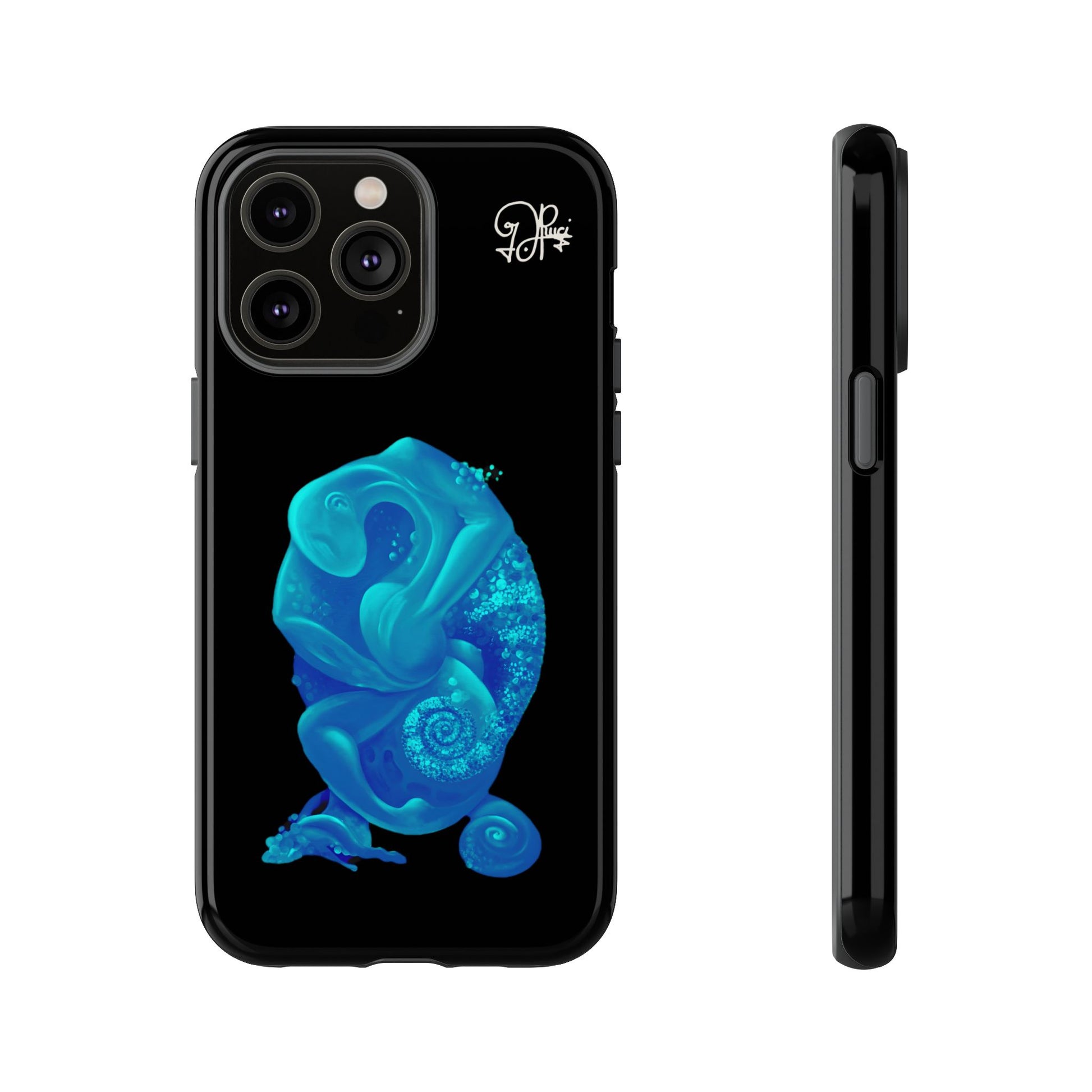 Sleek, protective, and quietly expressive — this phone case wraps your device in glossy black armor while a luminous blue creature drifts across the back like bioluminescent marine life. The artwork feels both mystical and modern: a curled, organic form with spiral details that catch the eye without shouting. It sits flush with ports, keeps a slim profile, and absorbs everyday shocks so you can move through city streets or late-night walks with one less worry. For people who collect small, surreal moments — the coastal stroller, the night-owl commuter, the art-obsessed friend — this case holds a tiny private world against the palm of your hand.