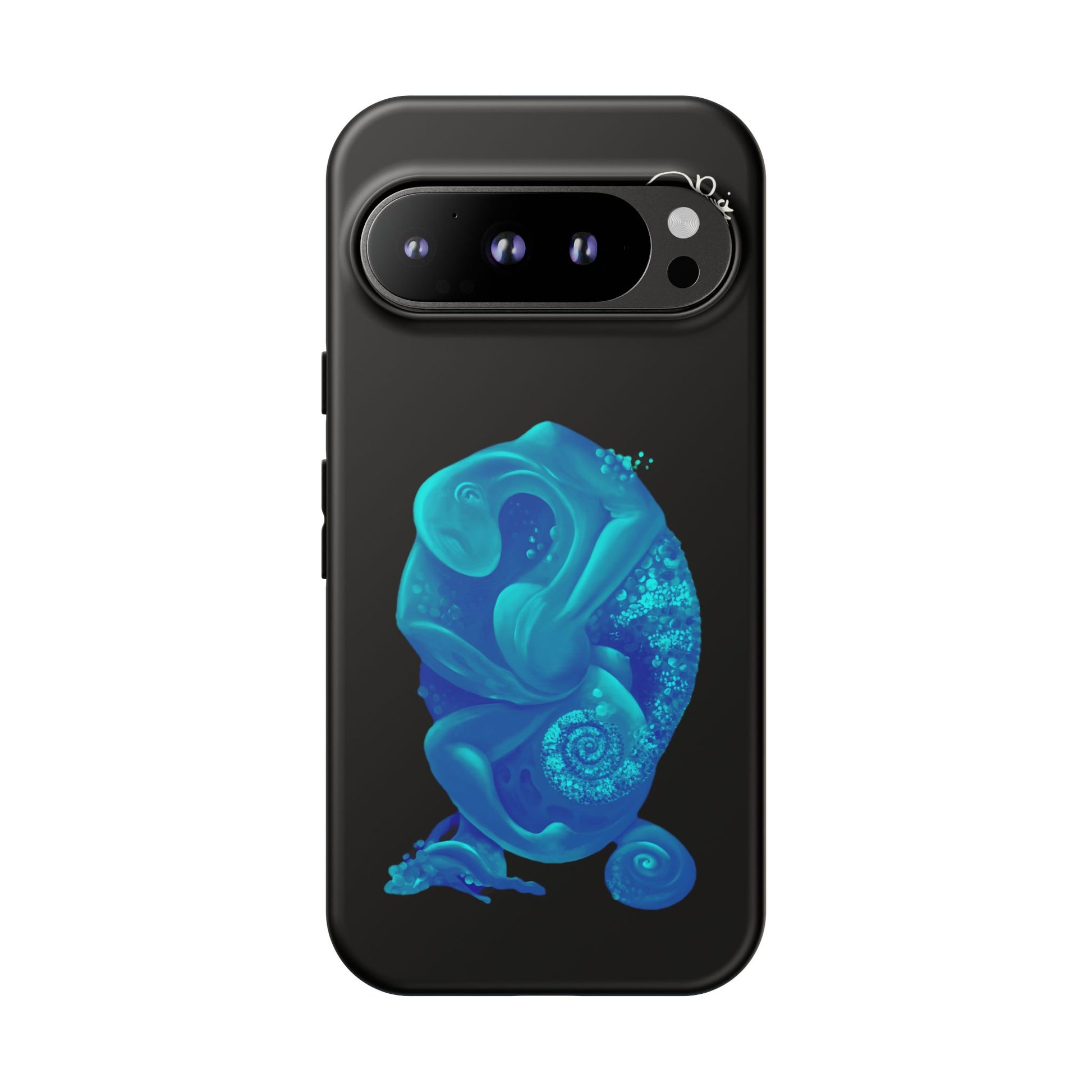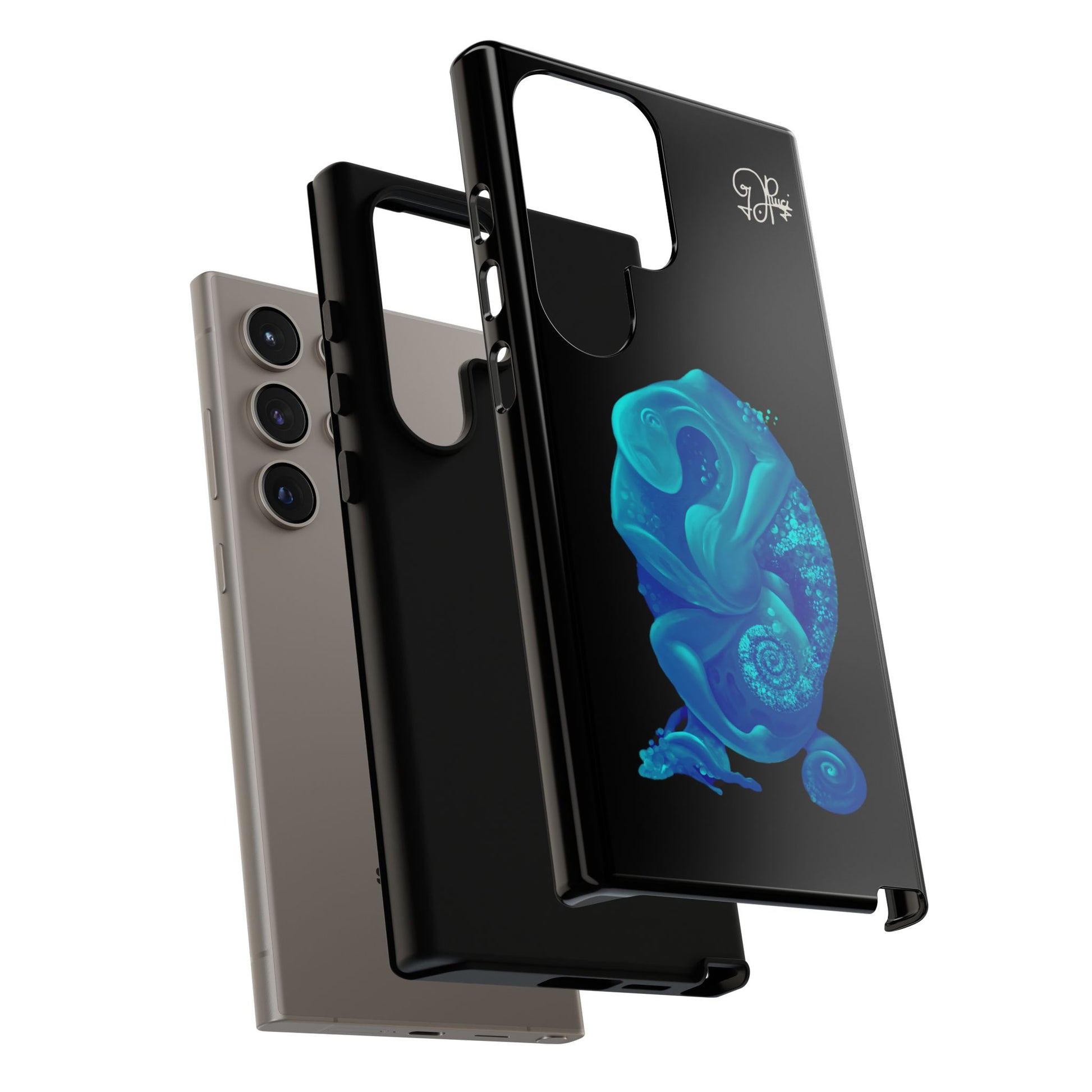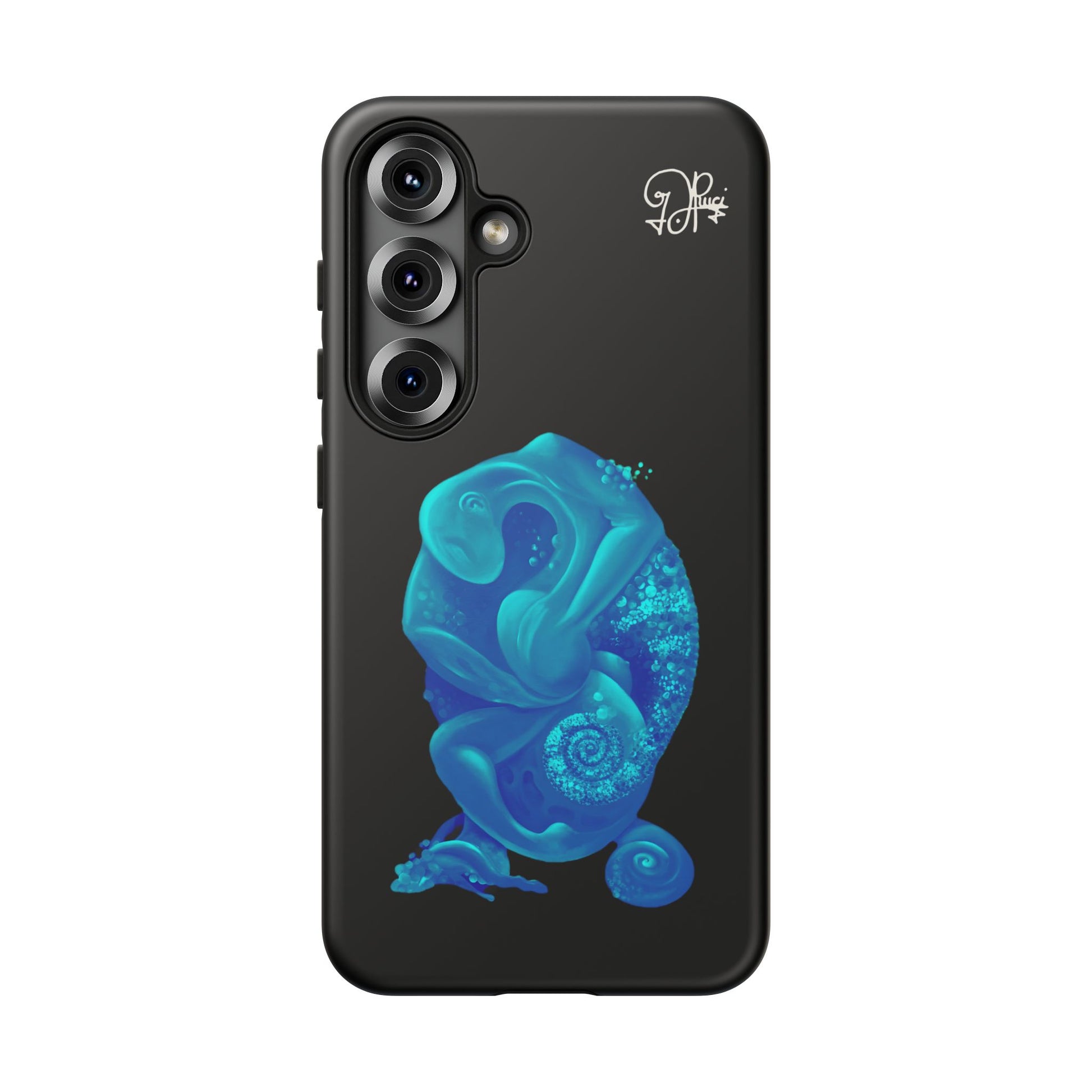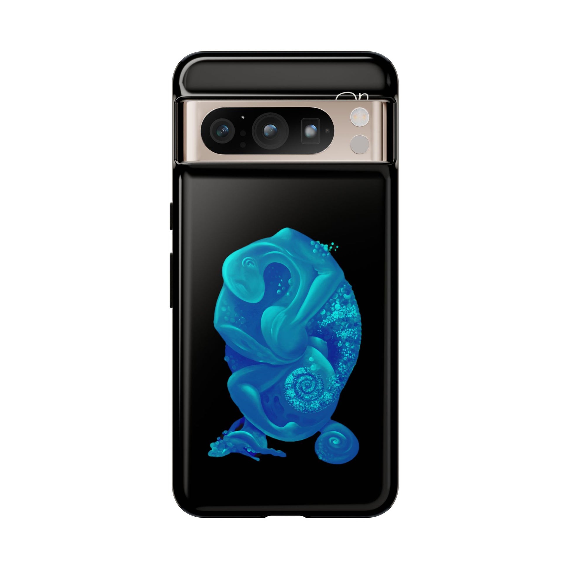 Sleek, protective, and quietly expressive — this phone case wraps your device in glossy black armor while a luminous blue creature drifts across the back like bioluminescent marine life. The artwork feels both mystical and modern: a curled, organic form with spiral details that catch the eye without shouting. It sits flush with ports, keeps a slim profile, and absorbs everyday shocks so you can move through city streets or late-night walks with one less worry. For people who collect small, surreal moments — the coastal stroller, the night-owl commuter, the art-obsessed friend — this case holds a tiny private world against the palm of your hand.