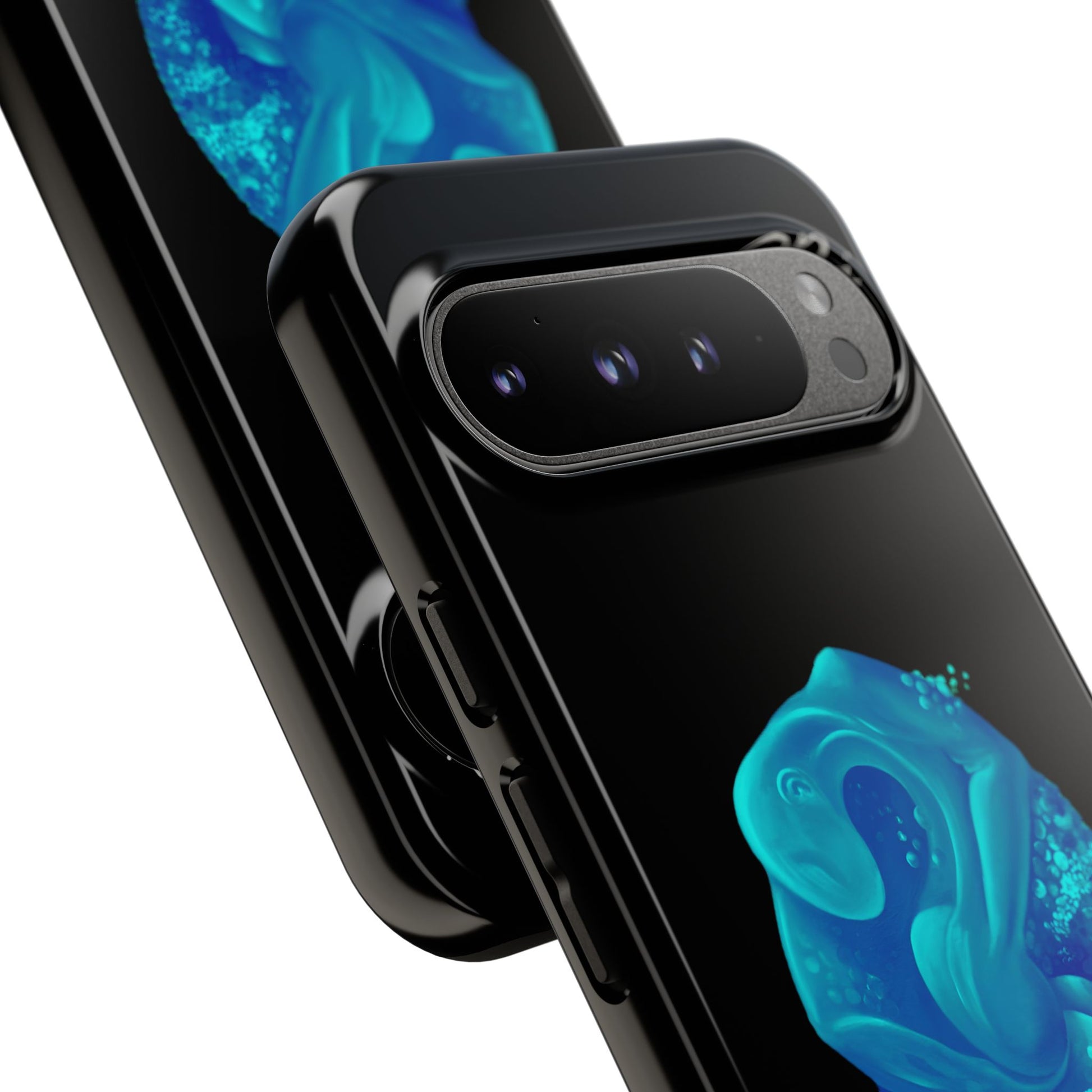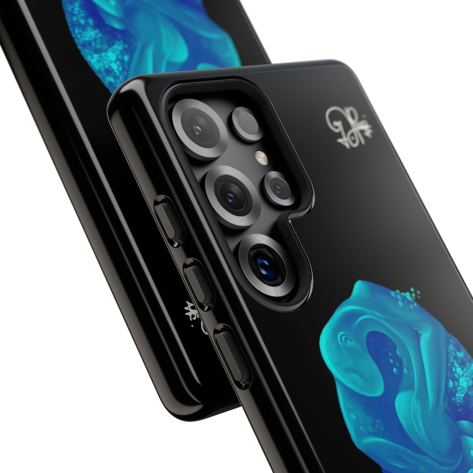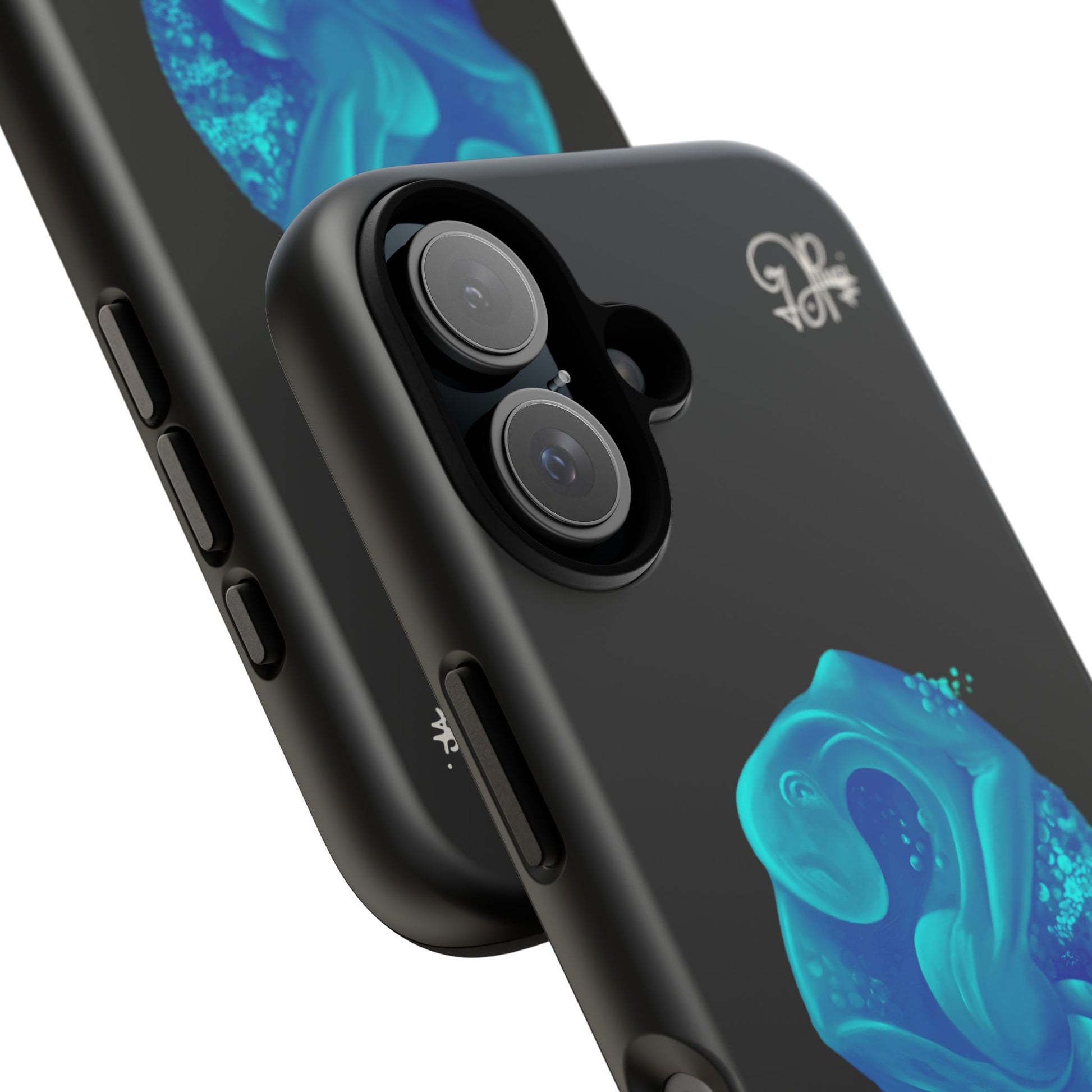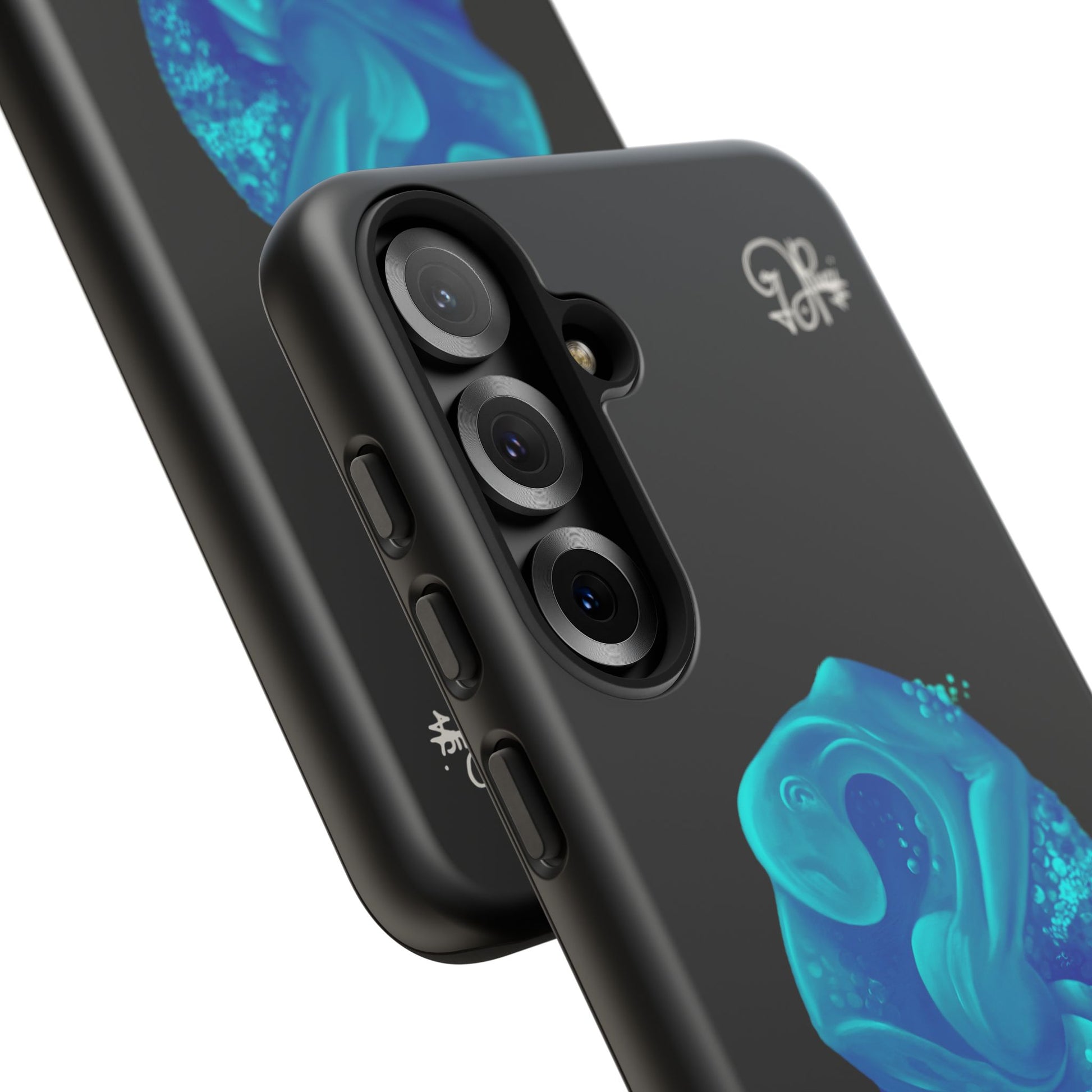 Sleek, protective, and quietly expressive — this phone case wraps your device in glossy black armor while a luminous blue creature drifts across the back like bioluminescent marine life. The artwork feels both mystical and modern: a curled, organic form with spiral details that catch the eye without shouting. It sits flush with ports, keeps a slim profile, and absorbs everyday shocks so you can move through city streets or late-night walks with one less worry. For people who collect small, surreal moments — the coastal stroller, the night-owl commuter, the art-obsessed friend — this case holds a tiny private world against the palm of your hand.