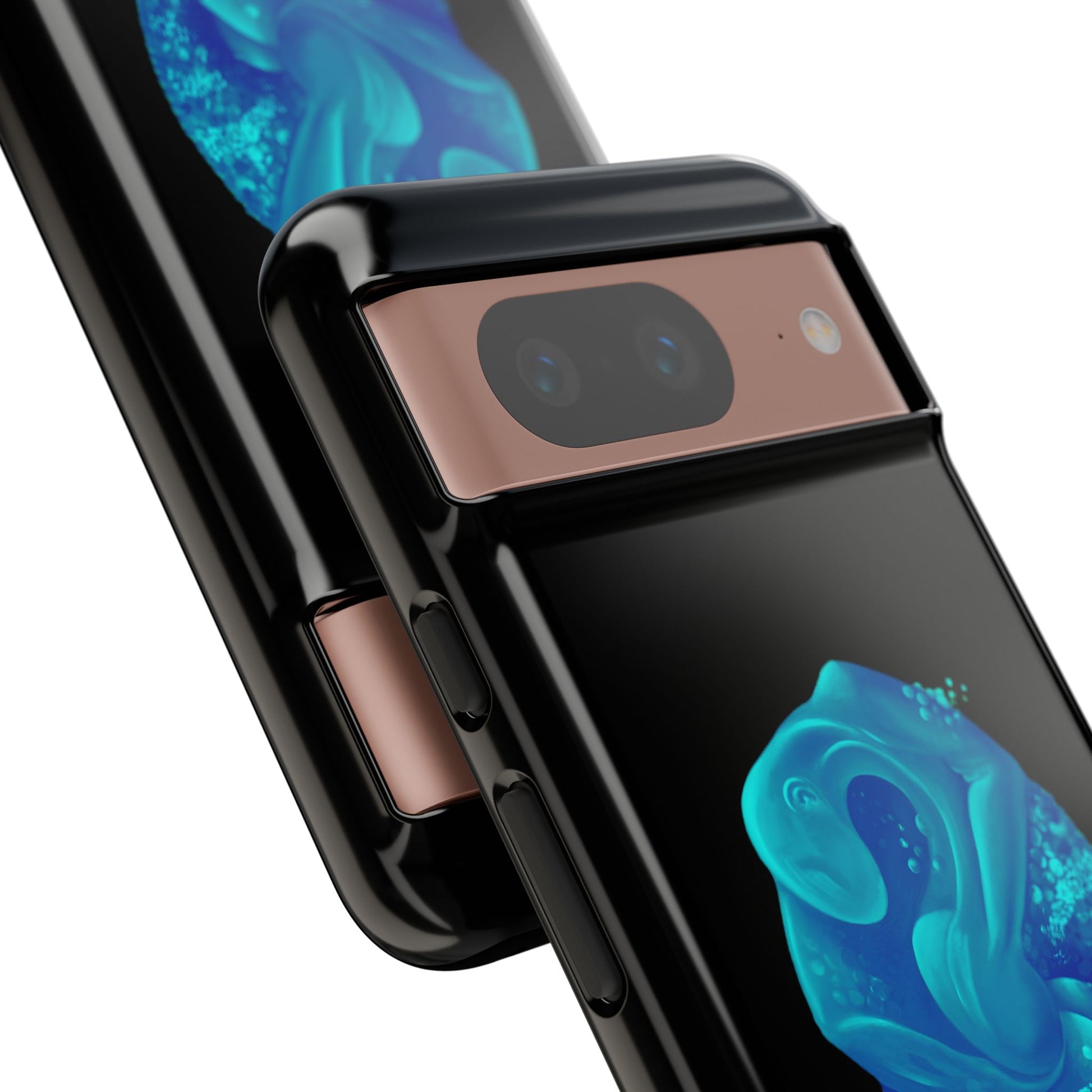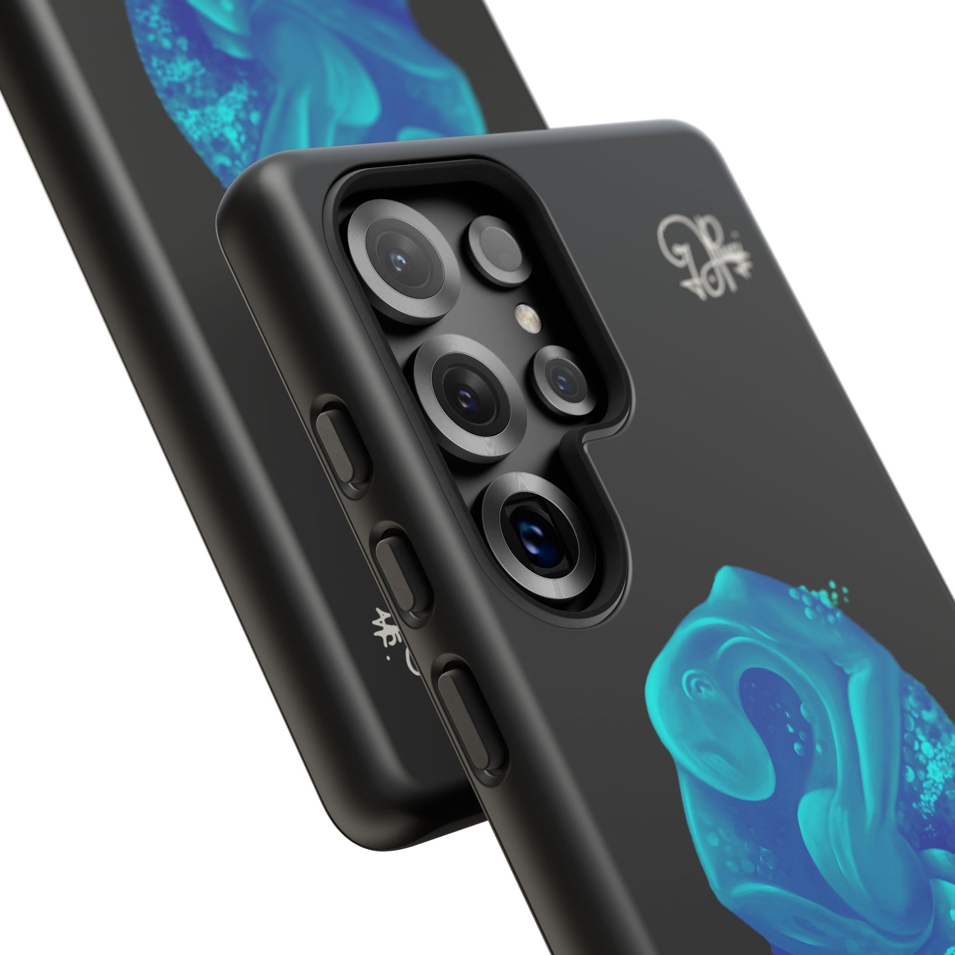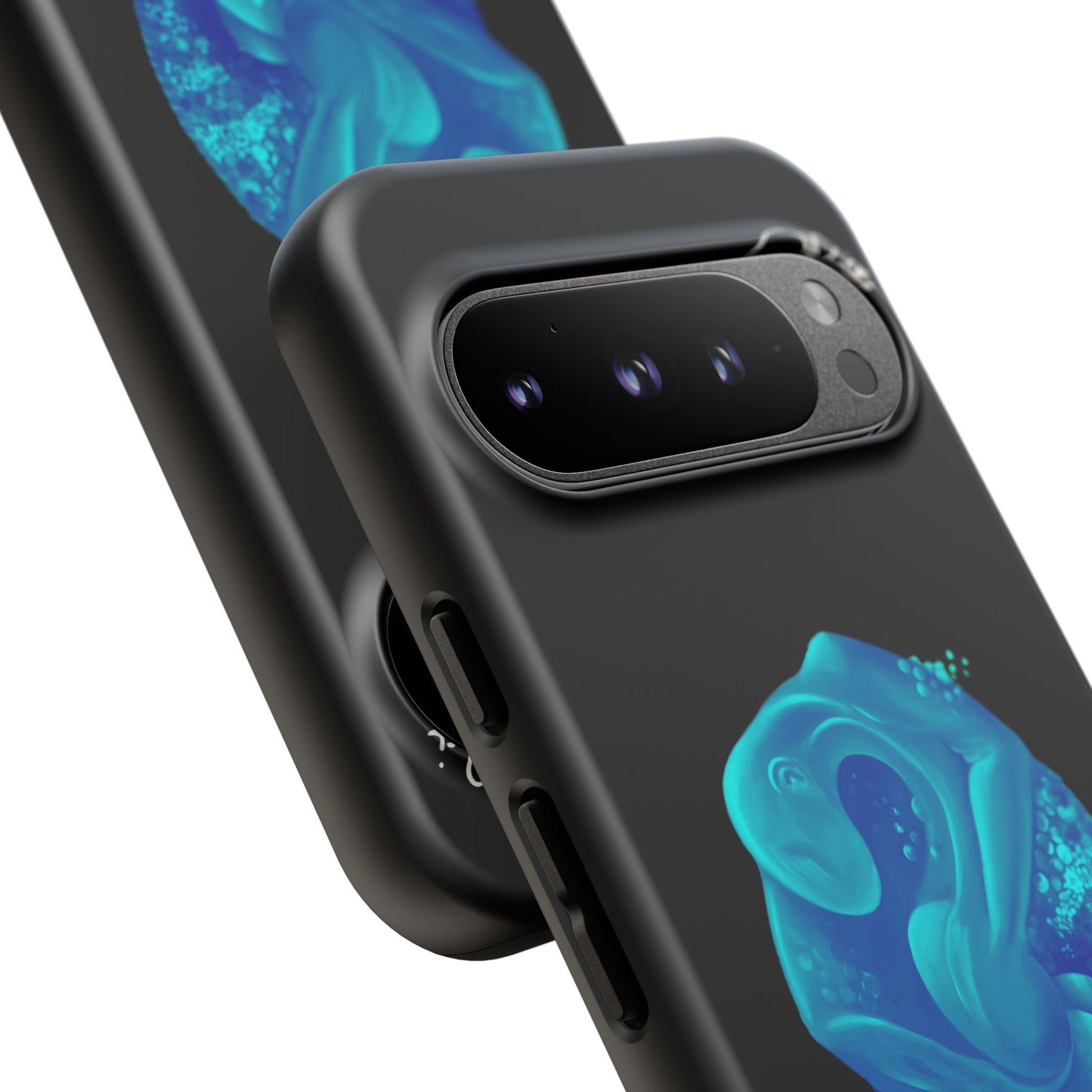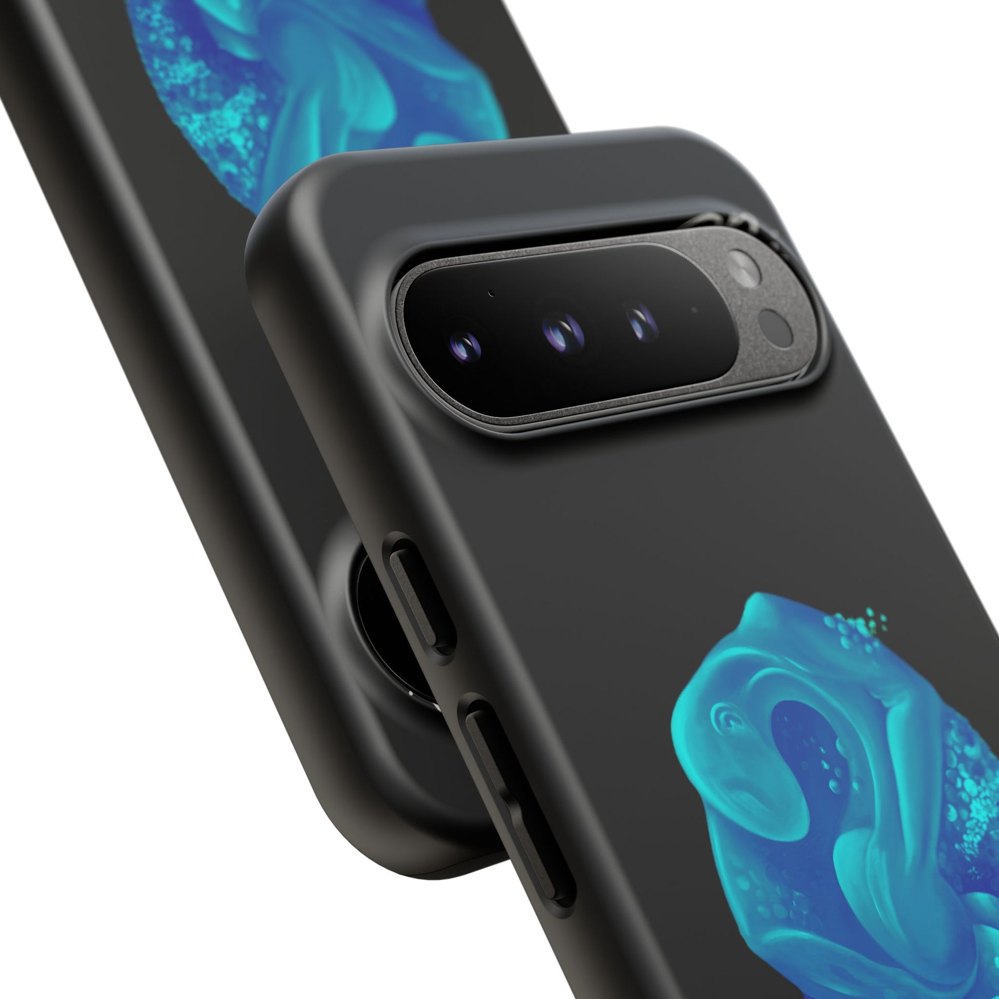 Sleek, protective, and quietly expressive — this phone case wraps your device in glossy black armor while a luminous blue creature drifts across the back like bioluminescent marine life. The artwork feels both mystical and modern: a curled, organic form with spiral details that catch the eye without shouting. It sits flush with ports, keeps a slim profile, and absorbs everyday shocks so you can move through city streets or late-night walks with one less worry. For people who collect small, surreal moments — the coastal stroller, the night-owl commuter, the art-obsessed friend — this case holds a tiny private world against the palm of your hand.